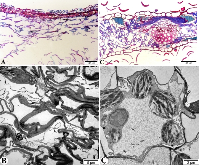 Fiksasiya prosesində istifadə olunan reaktivlərin tərkibində heç bir dəyişiklik olunmadan sol sütunda (Şəkil A və B) bitkilərin müxtəlif hissələrinin vakuumsuz, sağ sütunda (Şəkil C və Ç) isə temperatur rejimi ilə tənzimlənən vakuum aparatında fiksasiya olunduqdan sonra işıq (A və C) və elektron mikroskopunda (B və Ç) çəkilmiş şəkillərinin müqayisəsi verilib. İstər işıq, istərsə də ultrastruktur səviyyədə vakuumsuz şəraitdə fiksasiya olunmuş bitkilərin hüceyrəvi və qeyri-hüceyrəvi elementlərinin kəskin deformasiyası aydın görünür (A, B). Təsvir olunanların tam əksinə olaraq, vakuum aparatında fiksasiya olmuş preparatlarda hüceyrənin zarla əhatə olunmuş bütün strukturlarında nəzərə çarpacaq dəyişikliklər aşkar edilmir. Qeyd etmək lazımdır ki, zarlı və matriks elementlərinin mürəkkəbliyi ilə fərqlənən xloroplastların struktur elementləri yalnız vakuum aparatının iştirakı ilə fiksasiya olunmuş bitkilərdə aşkar olunub (Ç).