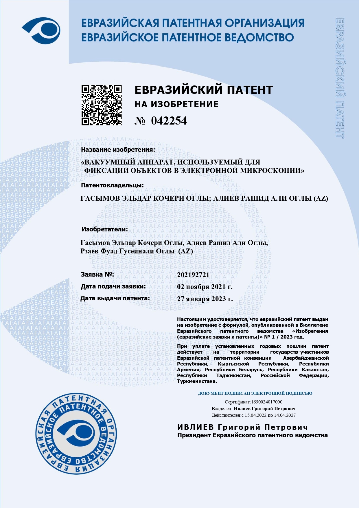 Belə ki, yanvarın 27-də Avrasiya Patent Təşkilatının qərarına əsasən, “Elektron mikroskopda obyektləri fiksasiya etmək üçün istifadə olunan vakuum aparatı” (№ 042254) patentləşdirilib.