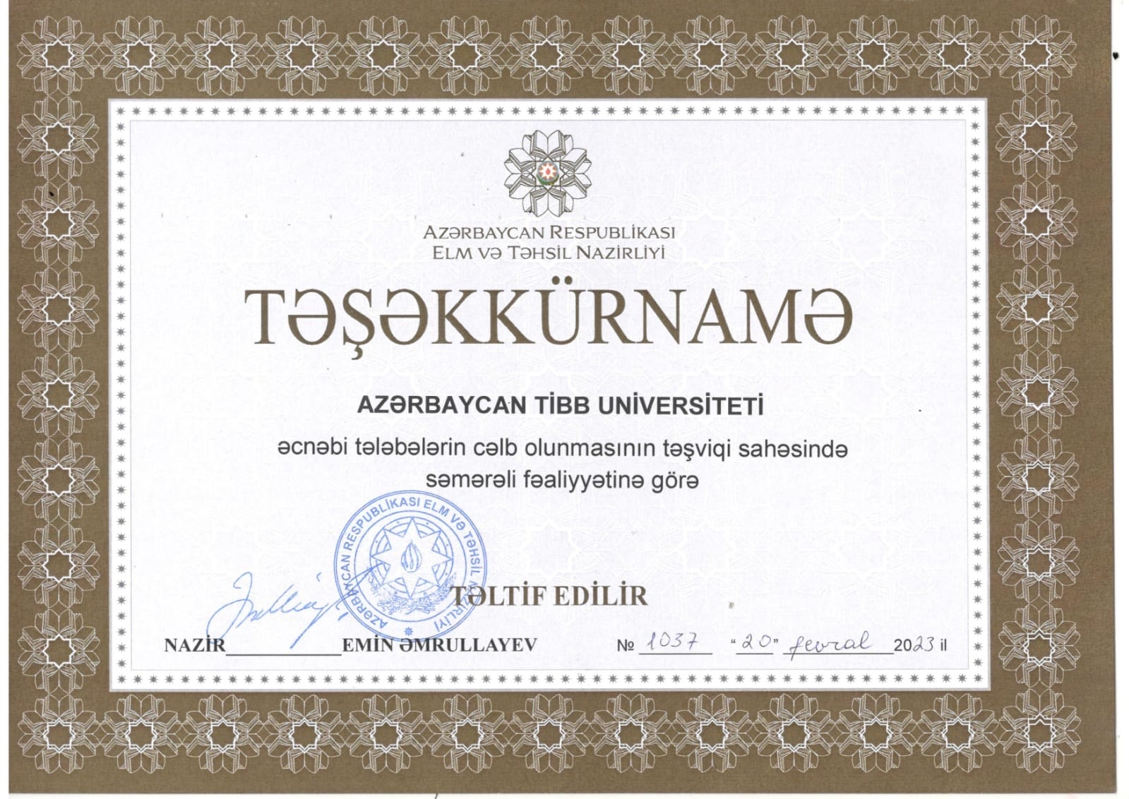 Azərbaycan Tibb Universiteti əcnəbi tələbələrin cəlbinin təşviqi və təhsilinin təşkili sahəsində xüsusi fərqləndiyinə görə Elm və Təhsil Nazirliyi tərəfindən  təşəkkürnamə ilə təltif edilib. Nazirlik əcnəbilərin sayında son 5 tədris ili üzrə artım dinamikası, tələbələrin qəbulu və məlumatların toplanılması sistemlərinin səmərəli istifadəsi, əcnəbi tələbələrin ictimai-sosial aktivliyinin təmin edilməsi kimi meyarları nəzərə almaqla ATU-nu təltif edib.