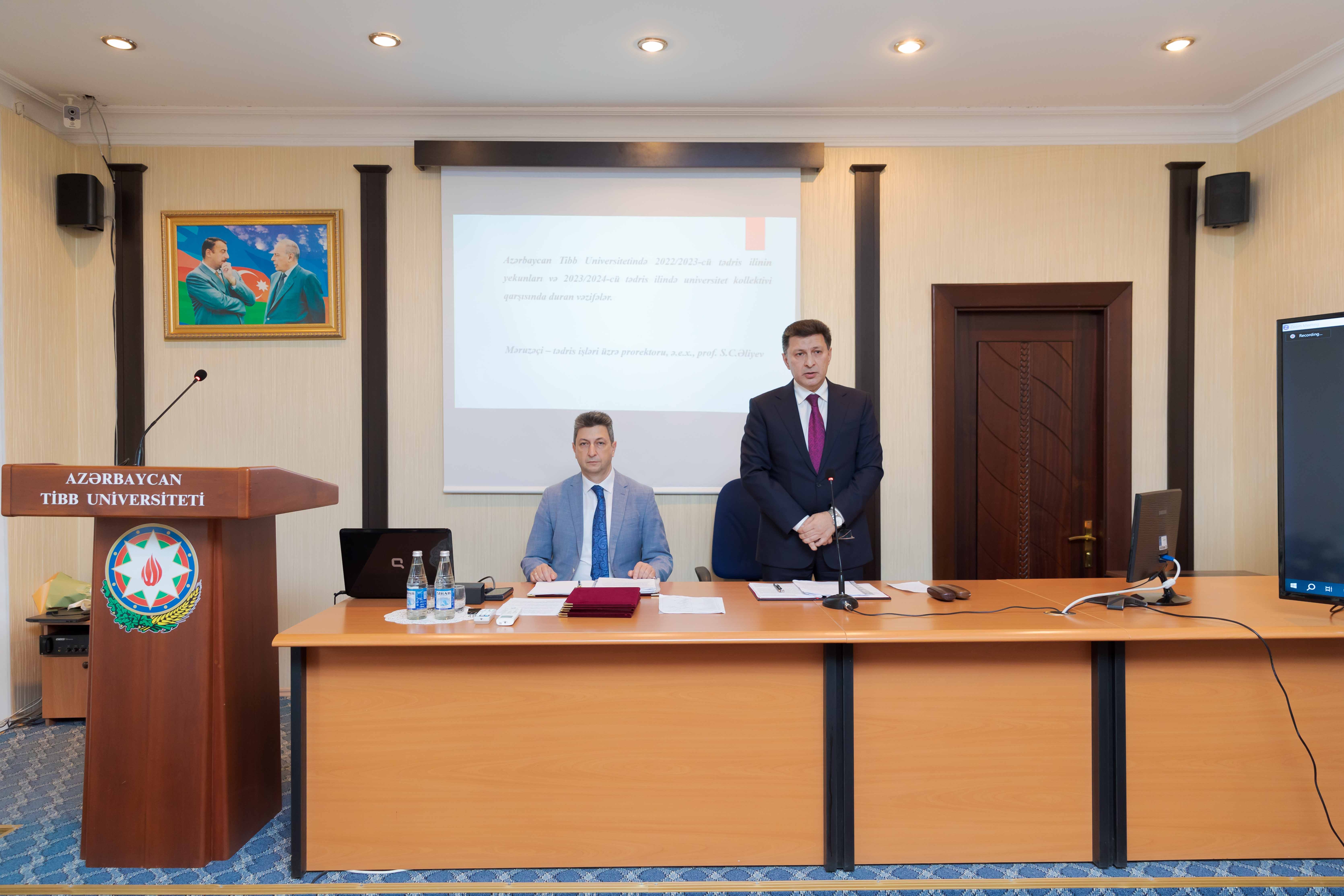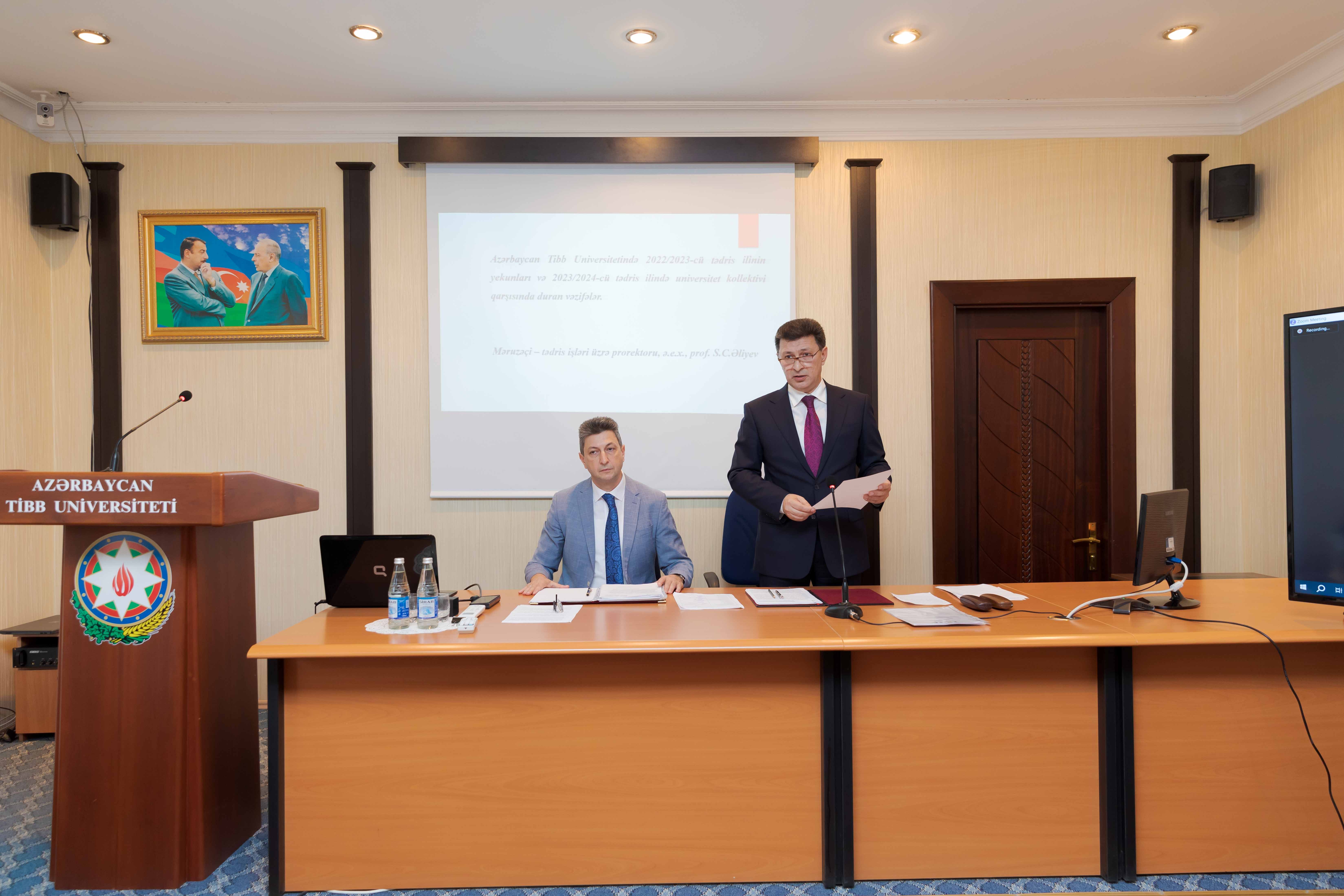 Daha sonra gündəlikdə duran məsələlərin müzakirəsinə başlanılıb. Əvvəlcə universitetin Tədris və müalicə işləri üzrə prorektoru, professor Sabir Əliyevin “Azərbaycan Tibb Universitetində 2022/2023-cü tədris ilinin yekunları və 2023/2024-cü tədris ilində universitet kollektivi qarşısında duran vəzifələr” barədə hesabat məruzəsi dinlənilib.