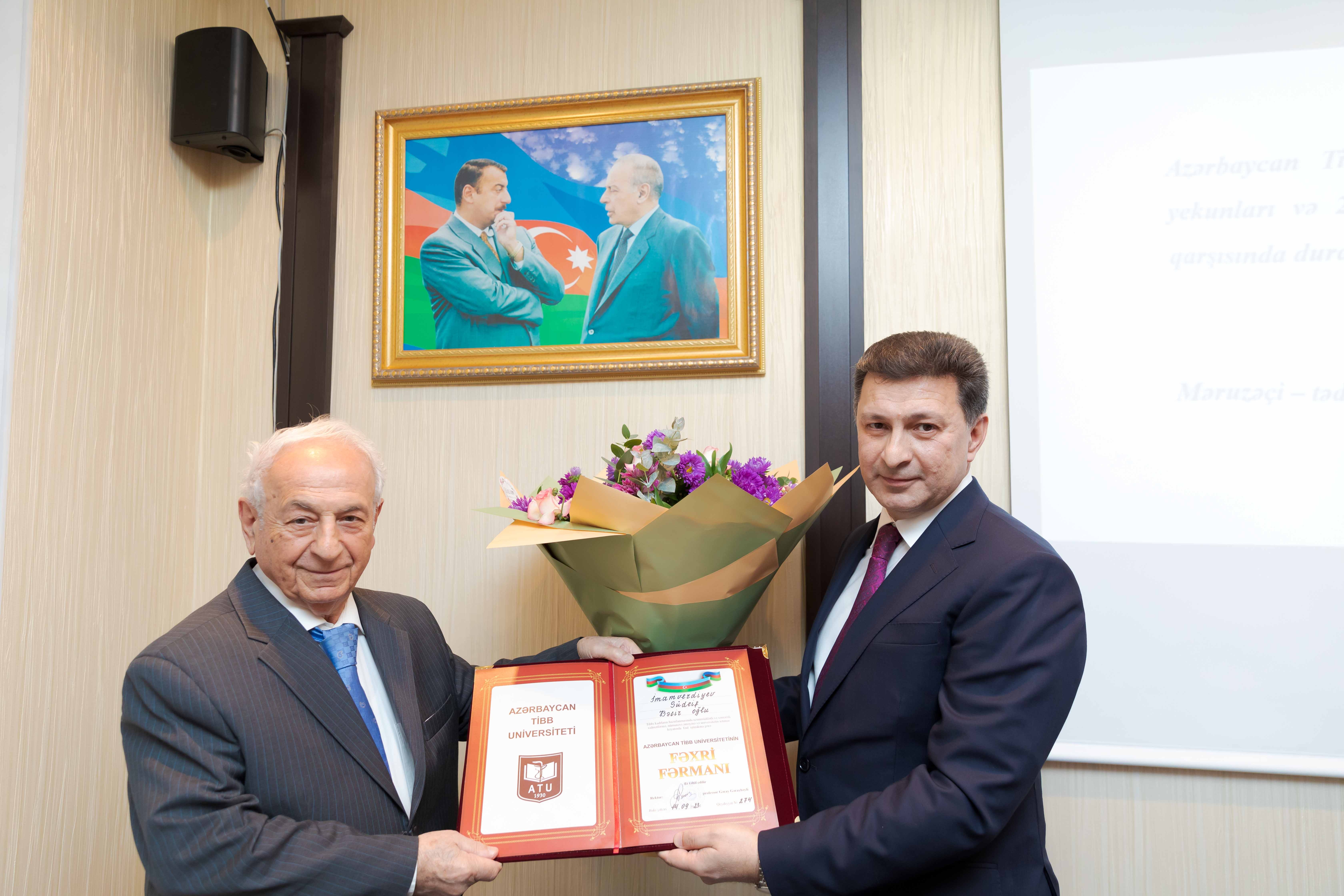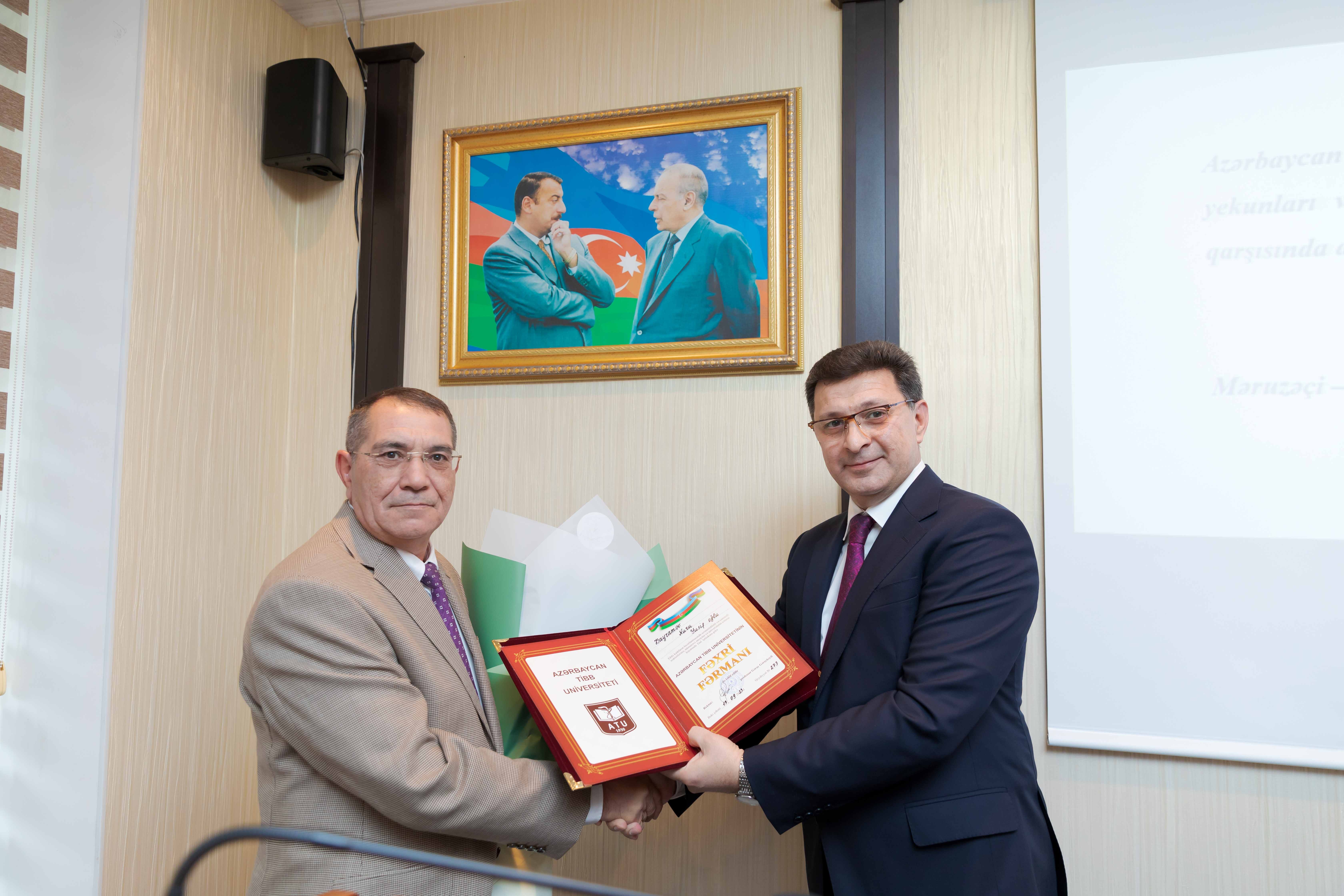 Bundan sonra AMEA-nın müxbir üzvü, professor Sudeyf İmamverdiyevi 85, AMEA-nın müxbir üzvü, professor Nuru Bayramovu isə 60 illik yubileyi münasibətilə təbrik edən rektor, 42 il ATU-nun Elmi Tədqiqat Mərkəzinə uğurla rəhbərlik edən və bu günlərdə öz ərizəsi ilə vəzifədən gedərək estafeti gənc kadrlara ötürən professor Qalib Qarayevin xidmətlərini də yüksək qiymətləndirib.