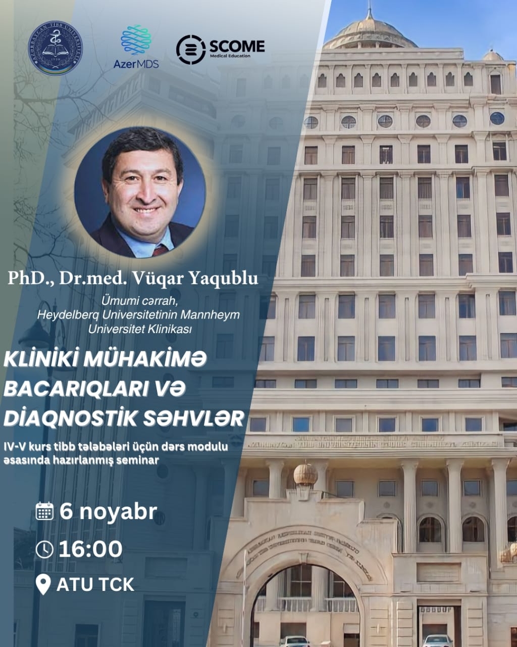 Heidelberg Universitetinin Mannhaym Tibb Fakültəsinin əməkdaşı, ümumi cərrah, eləcə də AzerMDS-in həmtəsisçisi Dr. Vüqar Yaqublu "Kliniki mühakimə bacarıqları və diaqnostik səhvlər" mövzusunda çıxış edəcək.