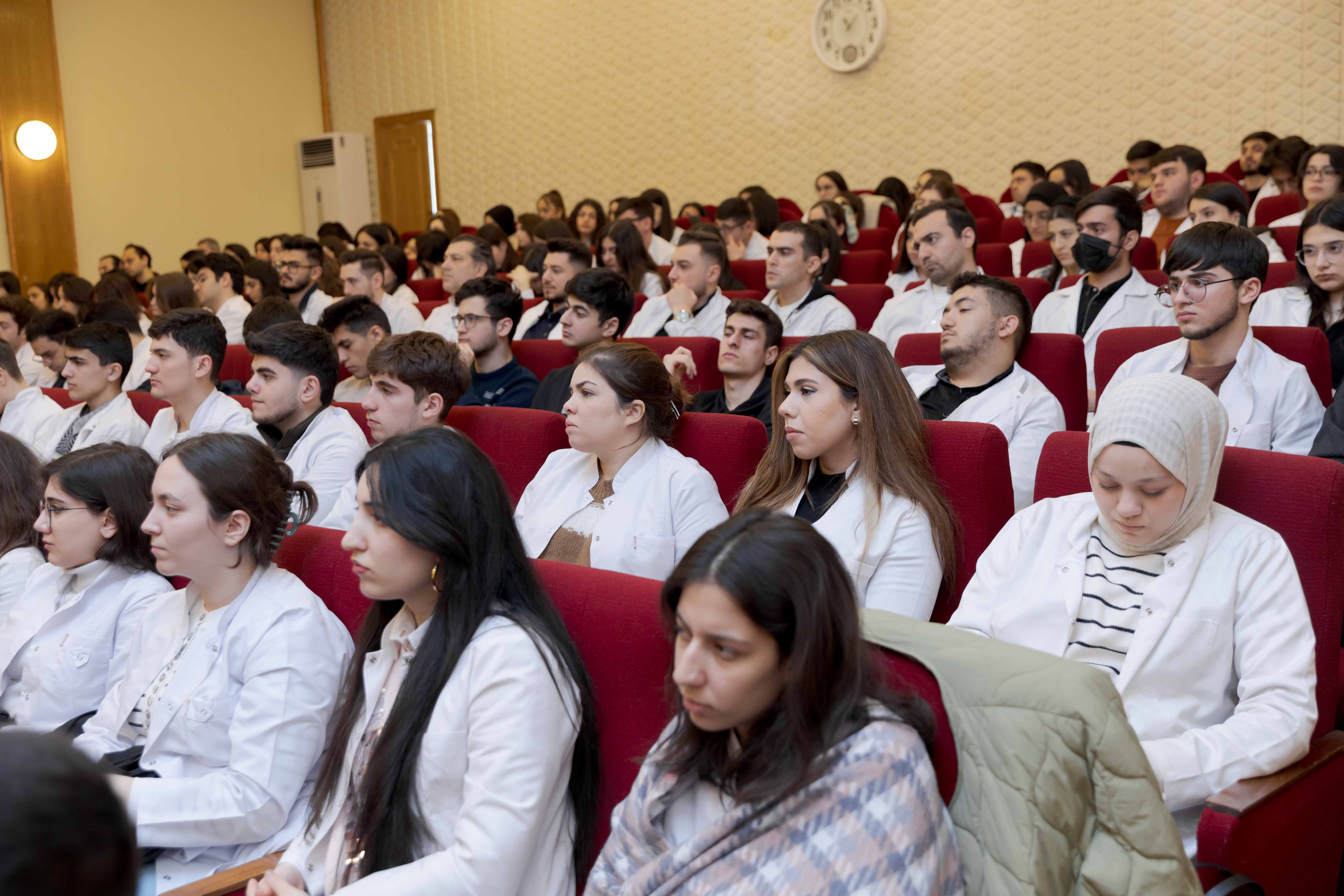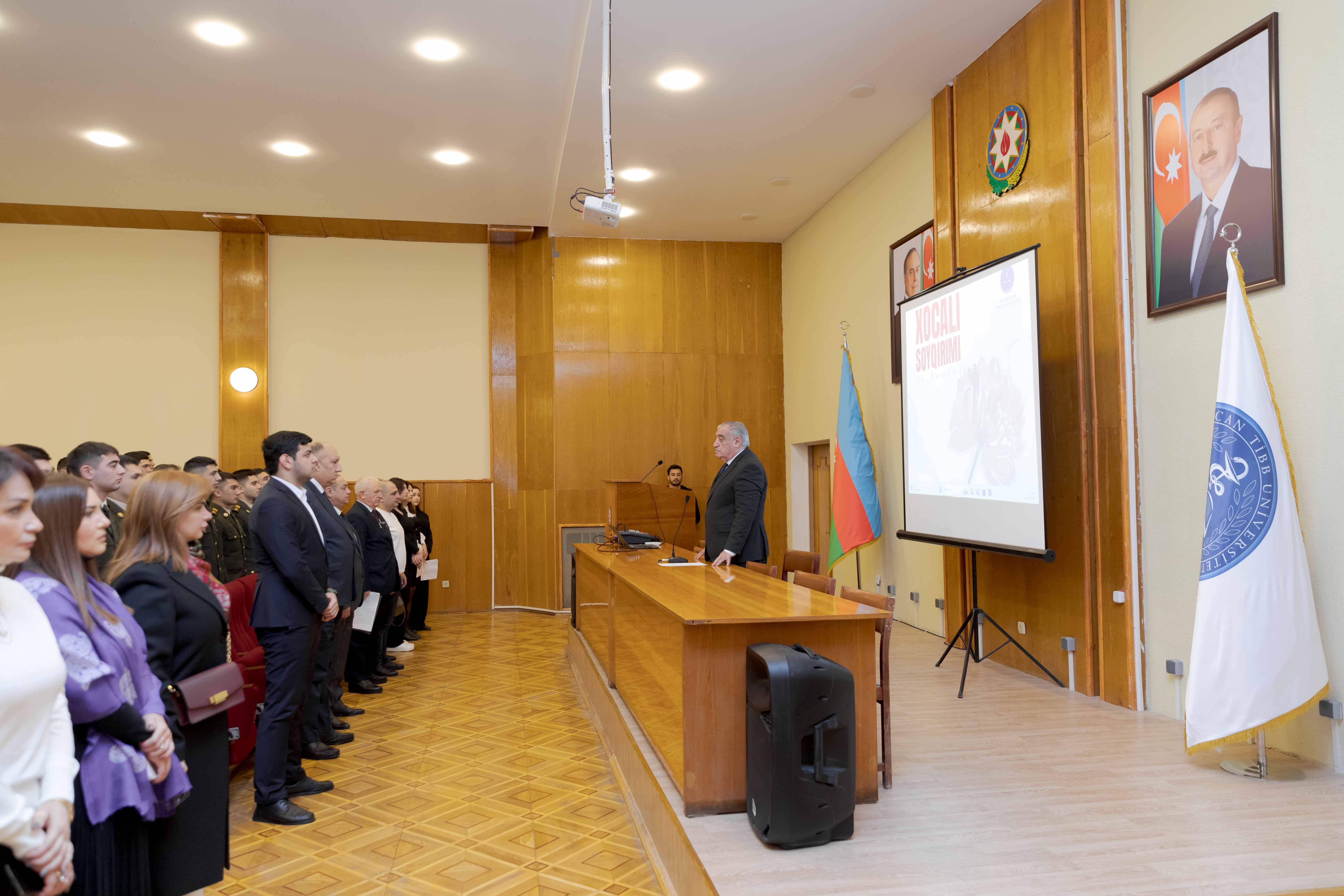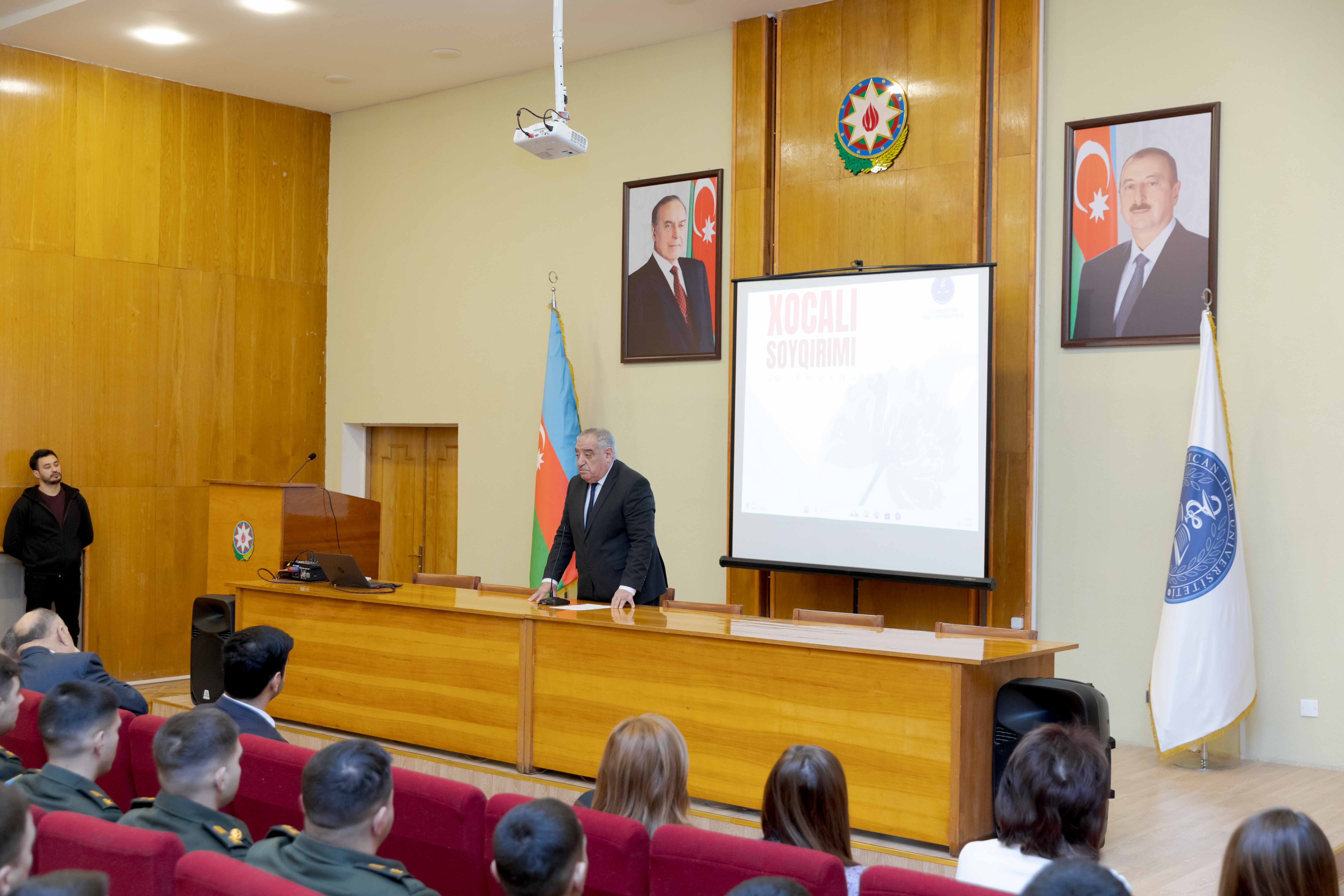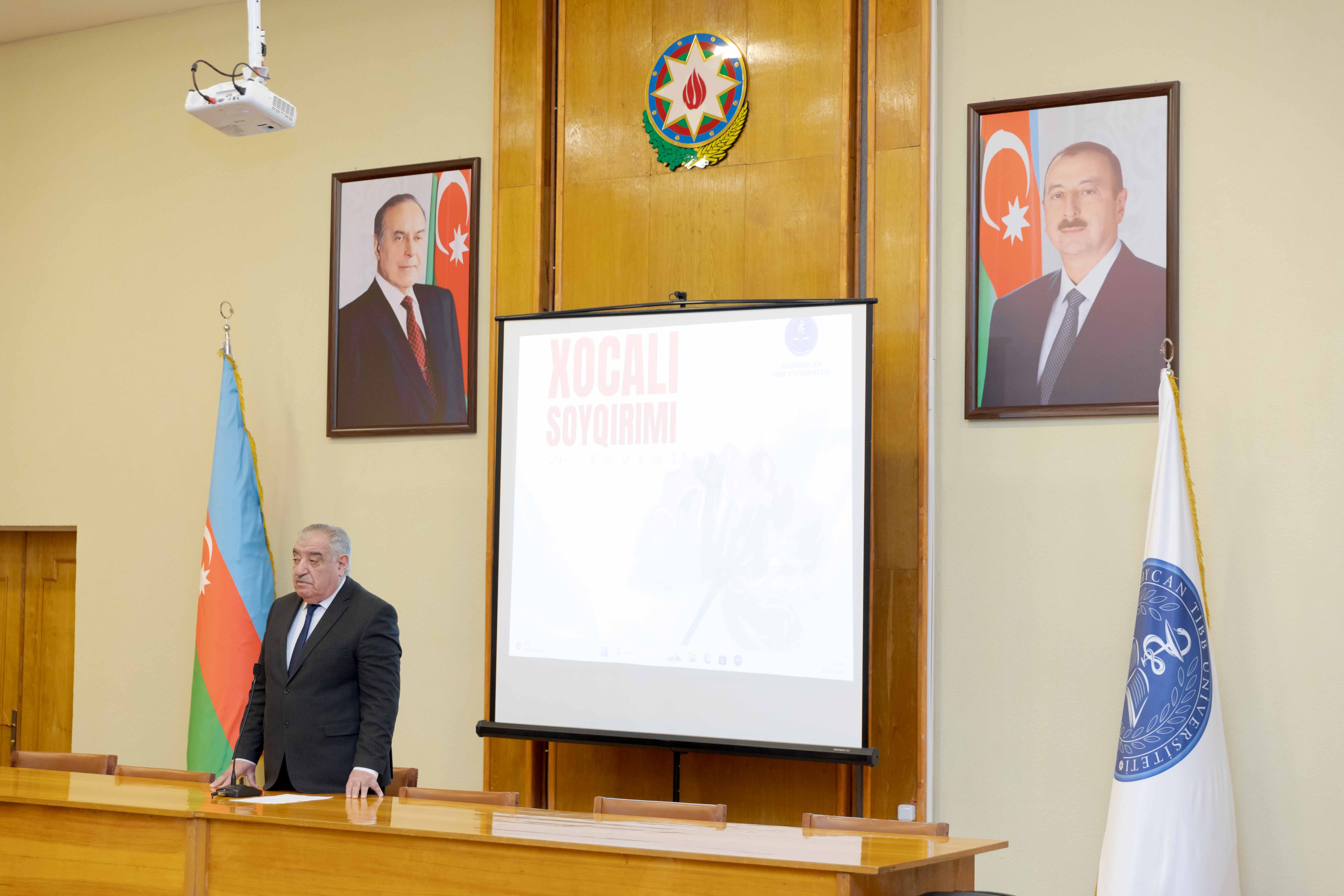Universitetin Tədris və müalicə işləri üzrə prorektoru, professor Sabir Əliyev tədbiri açaraq, dünyada insanlığa sığmayan ən qəddar və amansız terror hadisələrindən biri olan Xocalı soyqırımı haqqında danışıb: "Bu gün biz hər il olduğu kimi, yenə də xalqımızın tarixi faciələrindən birini anmağa toplaşmışıq. XX əsrdə Azərbaycan xalqının yaşadığı faciələri, soyqırımları, qətliamları bəlkə də dünyada heç bir xalq yaşamayıb. Əgər biz keçən əsrin əvvəlindən danışmağa başlasaq, o zaman görərik ki, tarixin müxtəlif dönəmlərində - 1905, 1907, 1917 və 1918-ci illərdə mənfur düşmənlərimiz tərəfindən ölkəmizə hücumlar edilib, qətliamlar törədilib. Bundan əlavə, 1948 və 1988-ci illərdə xalqımız Qərbi Azərbaycandan həm deportasiyaya məruz qalıb, həm də ağır və faciəli günlər yaşayıb".