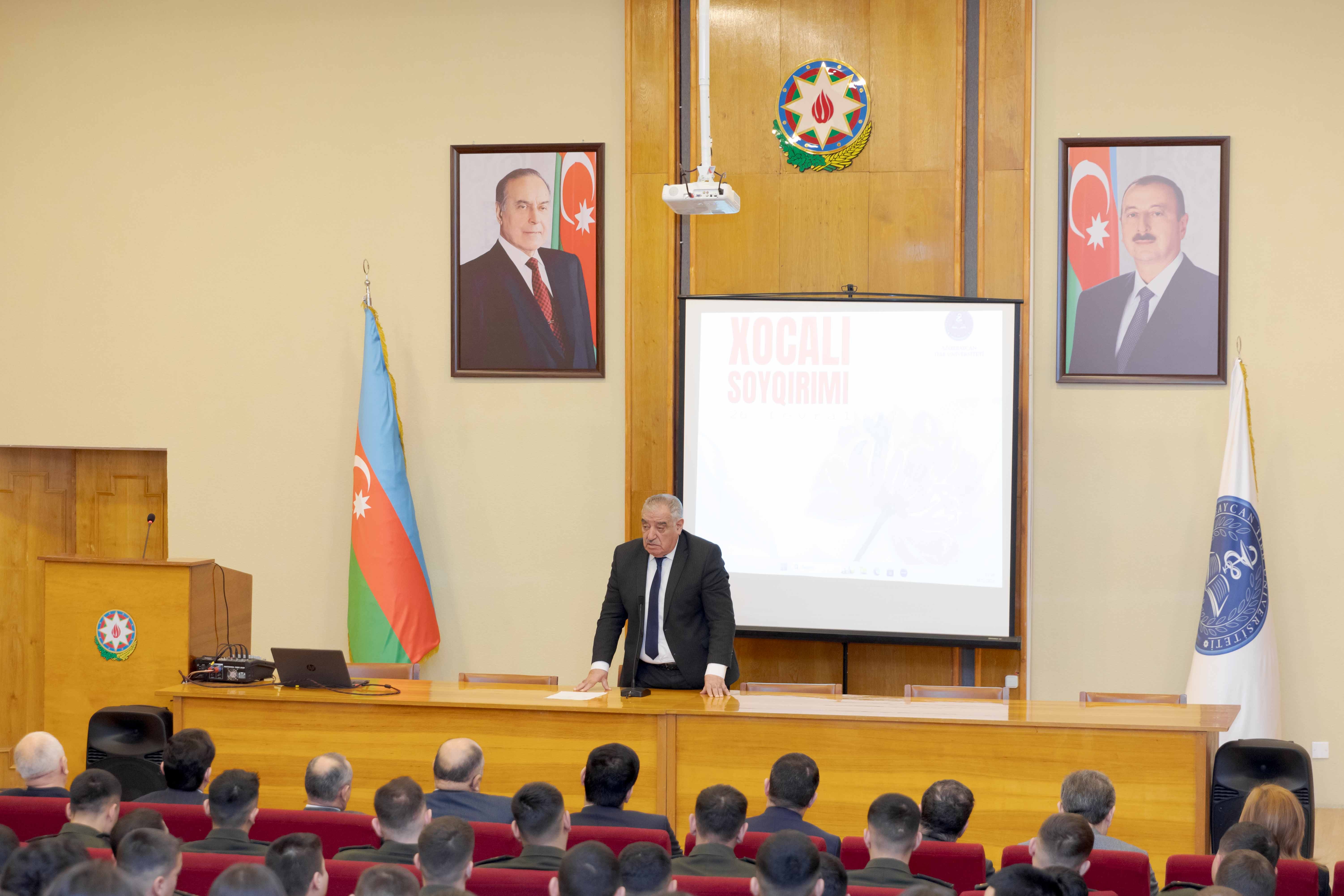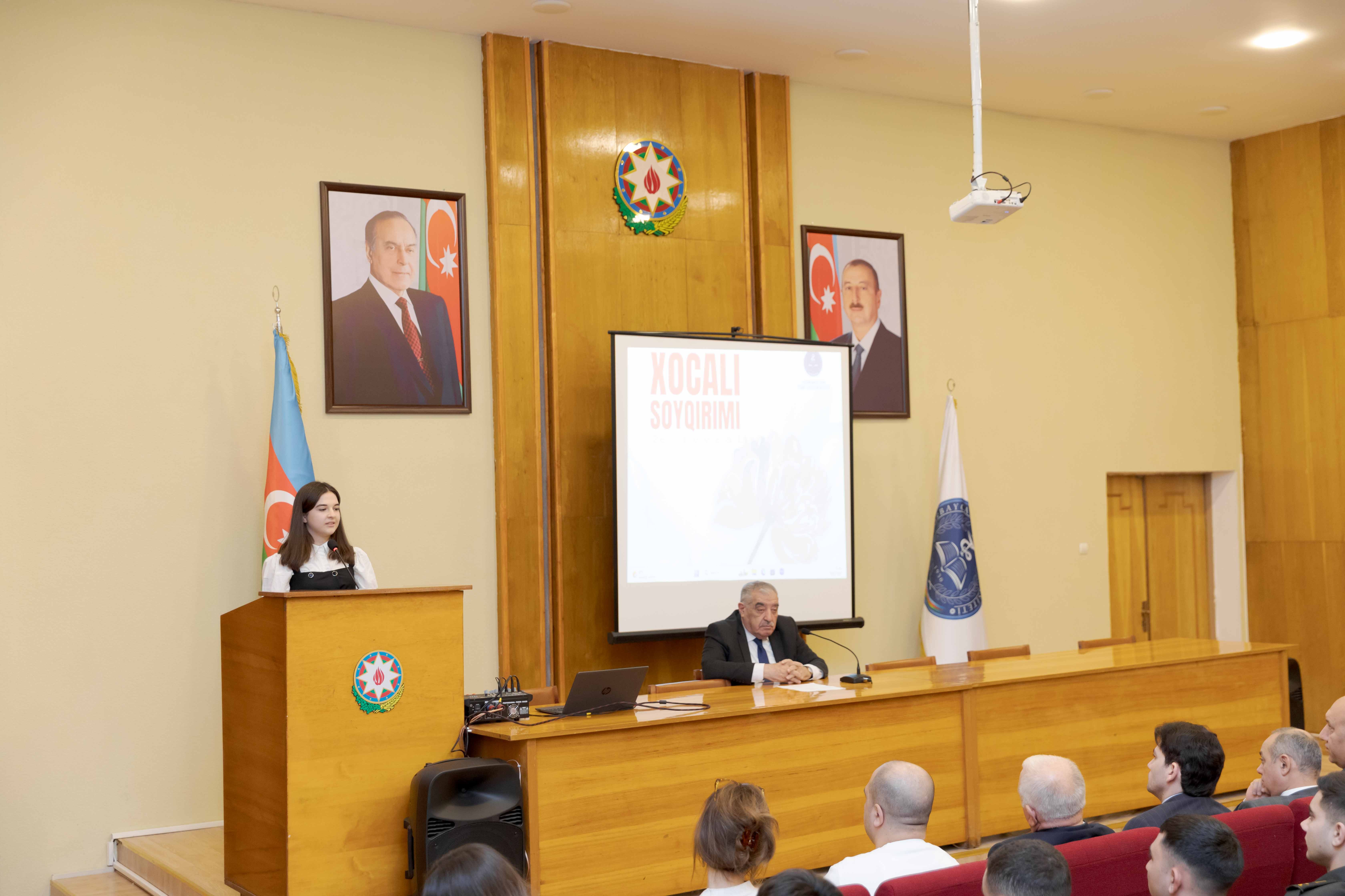 Sözünə davam edən prorektor deyib: “Lakin bunlardan ən böyüyü 1992-ci il  fevral ayının 25-dən 26-na keçən qarlı-şaxtalı bir qış gecəsində baş veriib. Erməni silahlı dəstələri keçmiş sovet ordusunun Xankəndi şəhərində yerləşən 366-cı alayının iştirakı ilə 7 min əhalisi olan Xocalıda genosid aktı həyata keçirdi və şəhəri yerlə-yeksan etdi. Bu hücum zamanı Xocalıda yalnız 3 minə yaxın insan qalmışdı. Çünki mühasirədə olduğu 4 aydan artıq vaxt ərzində əhalinin xeyli hissəsi şəhərdən çıxmaq məcburiyyətində qalmışdı. Soyqırımı zamanı 613 nəfər öldürüldü, 1000 nəfər müxtəlif yaşlı dinc sakin əlil oldu. 106 nəfər qadın, 63 azyaşlı uşaq, 70 qoca qətlə yetirildi. 8 ailə tamamilə məhv edildi, 25 uşaq hər iki valideynini, 130 nəfər valideynlərindən birini itirdi. Faciə baş verən gecə 1275 nəfər dinc sakin girov götürüldü, onların 200-ə yaxınının taleyi indiyədək məlum deyil. Hazırda işğaldan azad olunan ərazilərdə bərpa-tikinti işləri gedir. Bu günlərdə Xocalı şəhərində aparılan qazıntı işləri zamanı növbəti kütləvi məzarlıq aşkarlanıb və 5 nəfərin qalıqları tapılıb”.