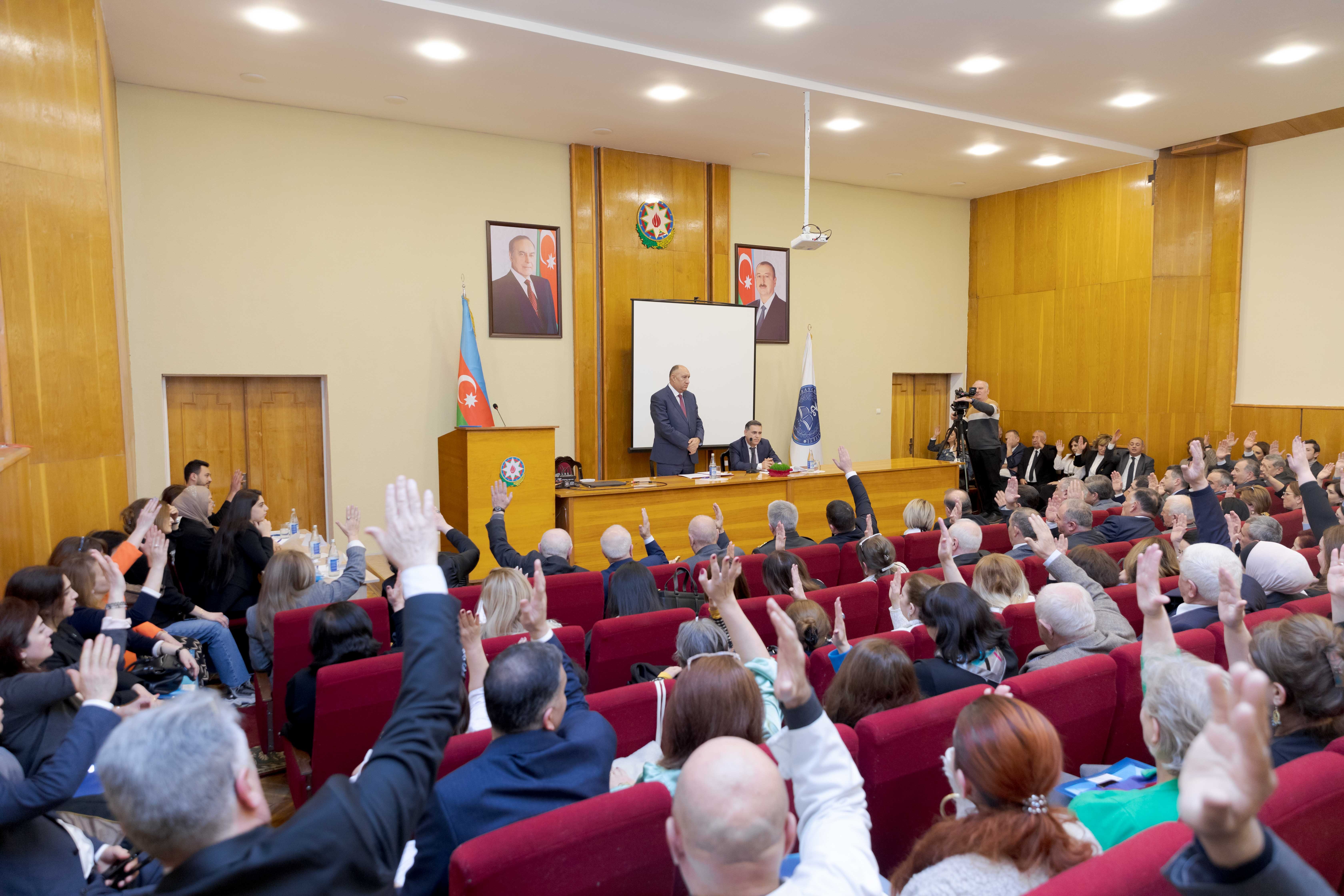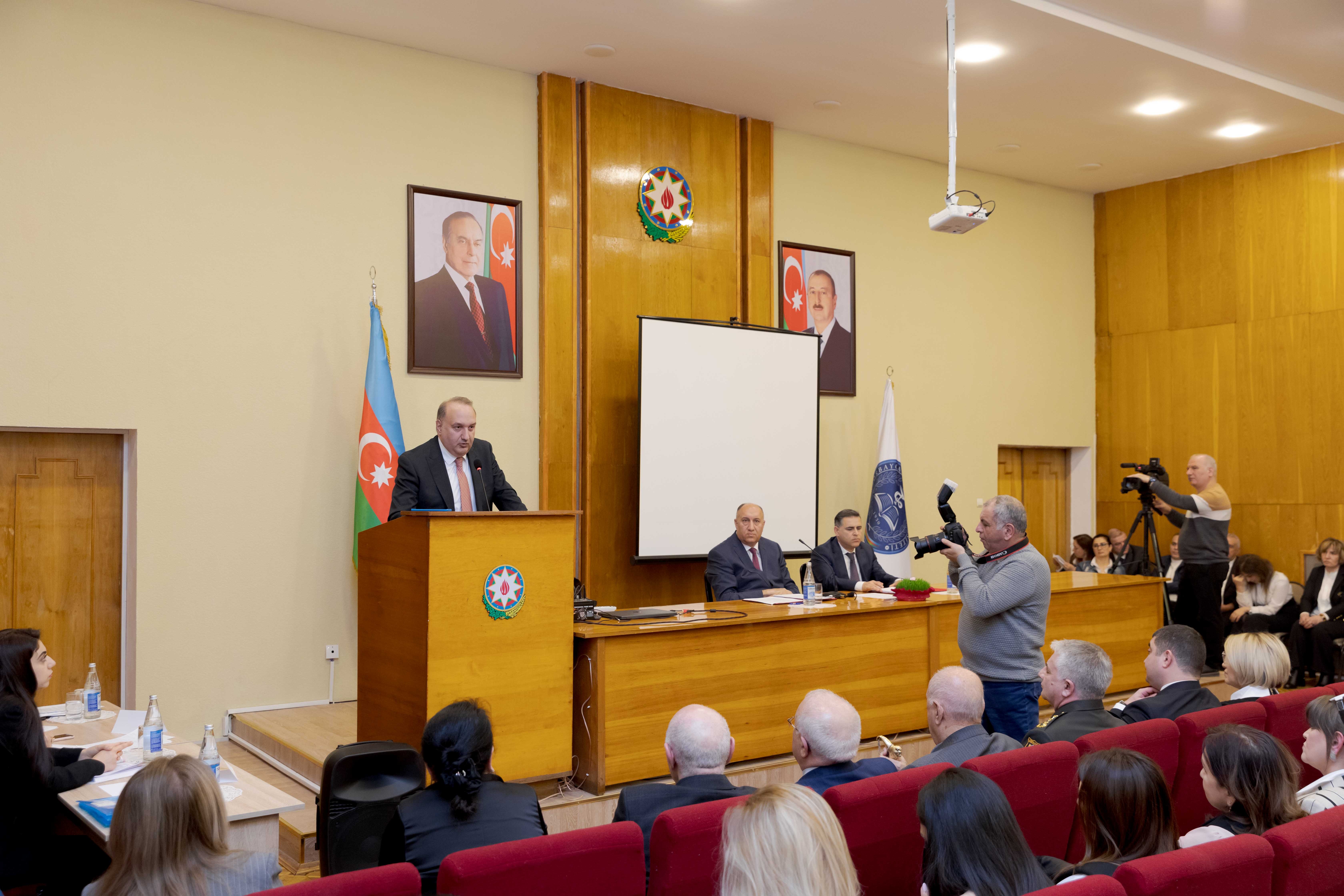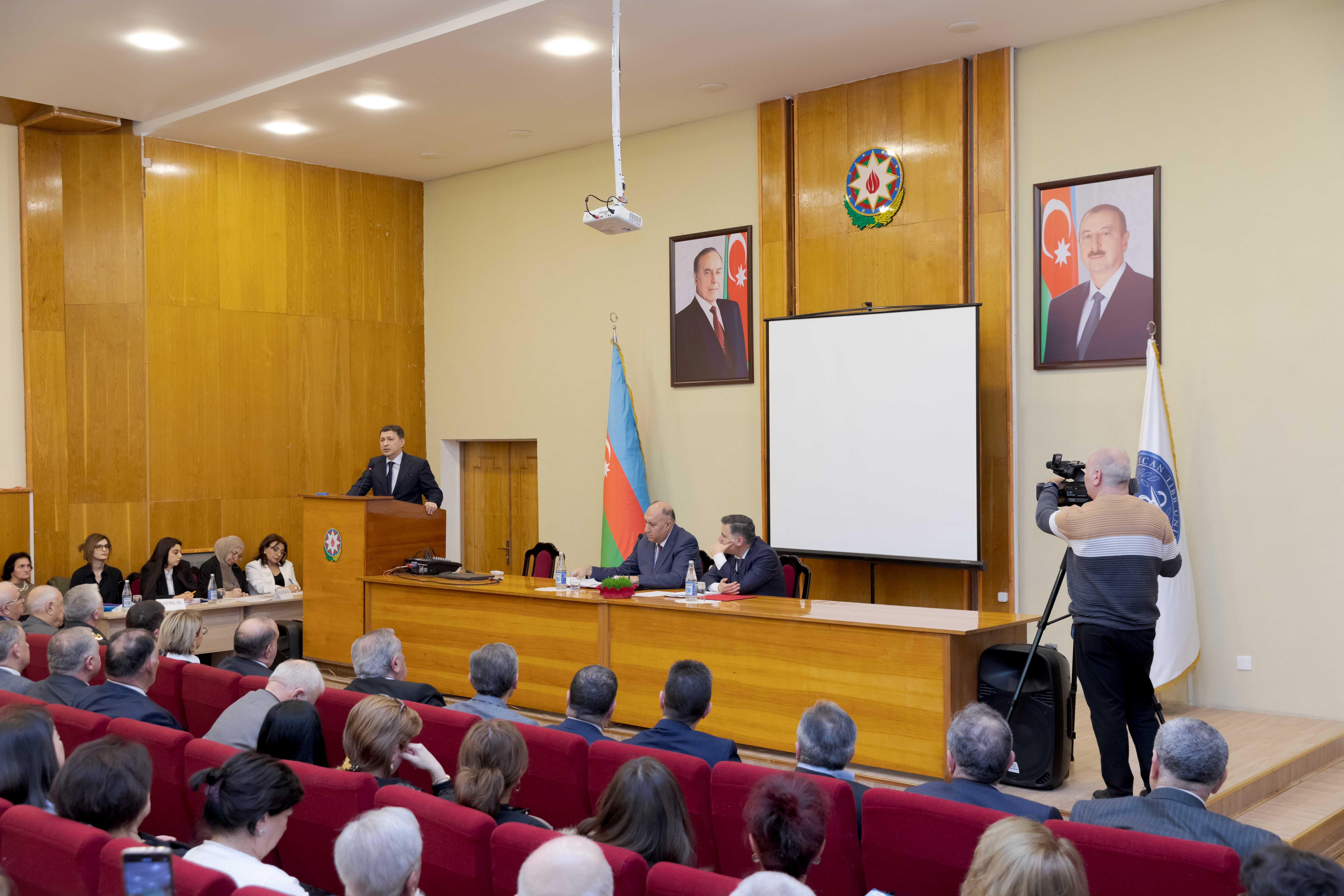 ATU HİK-in sədri, dosent Cahangir Qasımov çıxış edərək, son 7 il ərzində komitə tərəfindən görülən işlər haqqında danışıb. Bildirib ki, HİK-in XIV hesabat-seçki konfransı çox əlamətdar bir zamanda keçirilir: “Otuz il düşmən tapdağında olan torpaqlarımızın qaytarılmasına xalqımızın həmişə böyük ümidi və inamı vardı. Ulu Öndərin yaratdığı bu inam, qəhrəman ordumuzun döyüşkənlik ruhu və Müzəffər Ali Baş Komandanın qətiyyətli addımı ilə 2020-ci ildə 44 günlük Vətən müharibəsi nəticəsində torpaqlarımızın böyük bir hissəsi düşmən tapdağından azad edildi və tarixə 8 noyabr - Zəfər Günü kimi yazıldı. 2023-cü il sentyabr ayının 19-dan 20-nə keçən gecə isə antiterror əməliyyatı dövlət suverenliyimizin tam bərpa olunması ilə nəticələndi və İlham Əliyev cənabları Xankəndi şəhərində üçrəngli bayrağımızı ucaltdı. Bundan ruhlanan qədirbilən xalqımız bu il fevralın 7-də keçirilən növbədənkənar prezident seçkilərində yenidən Müzəffər Ali Baş Komandan İlham Əliyevə səs verdi”.
