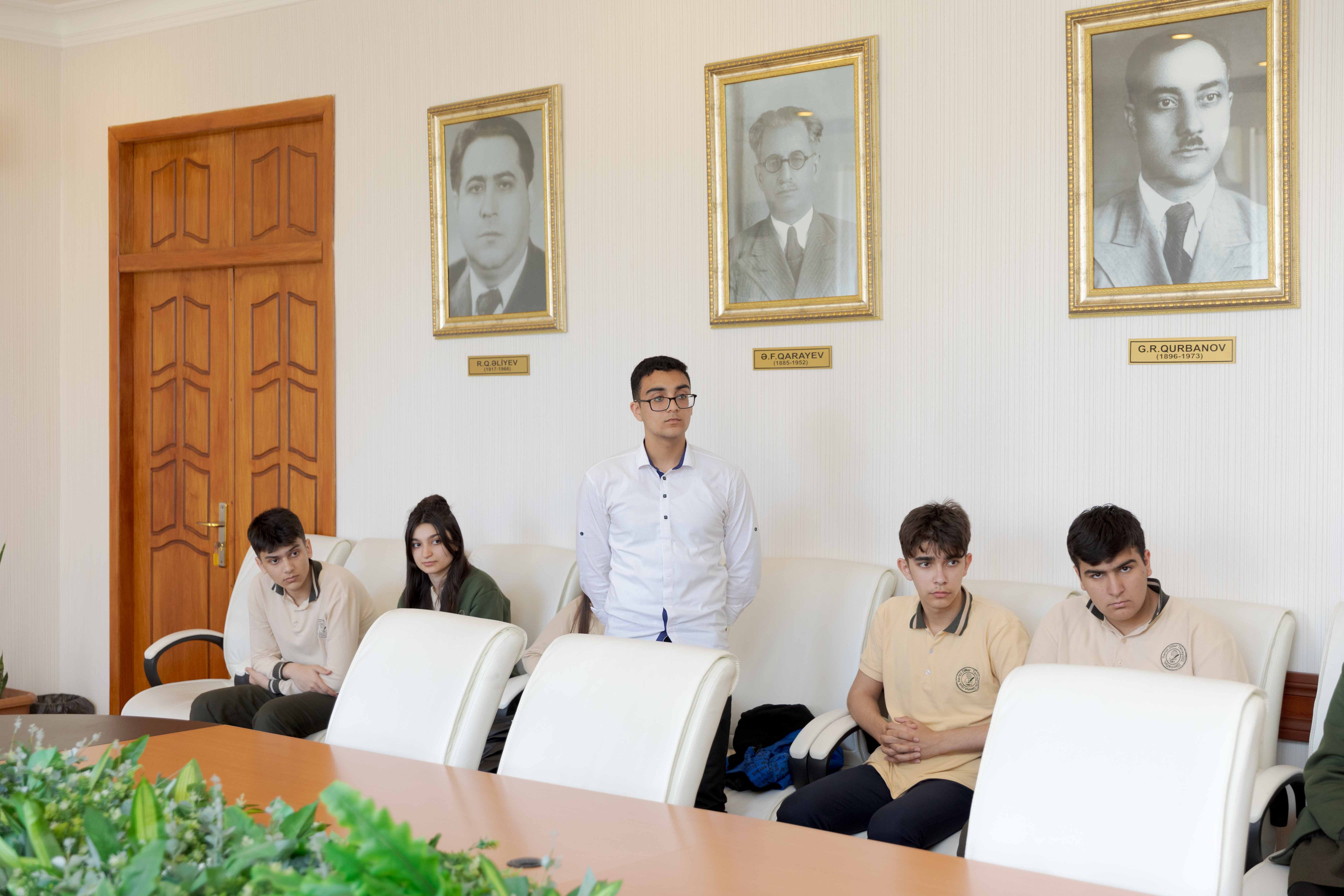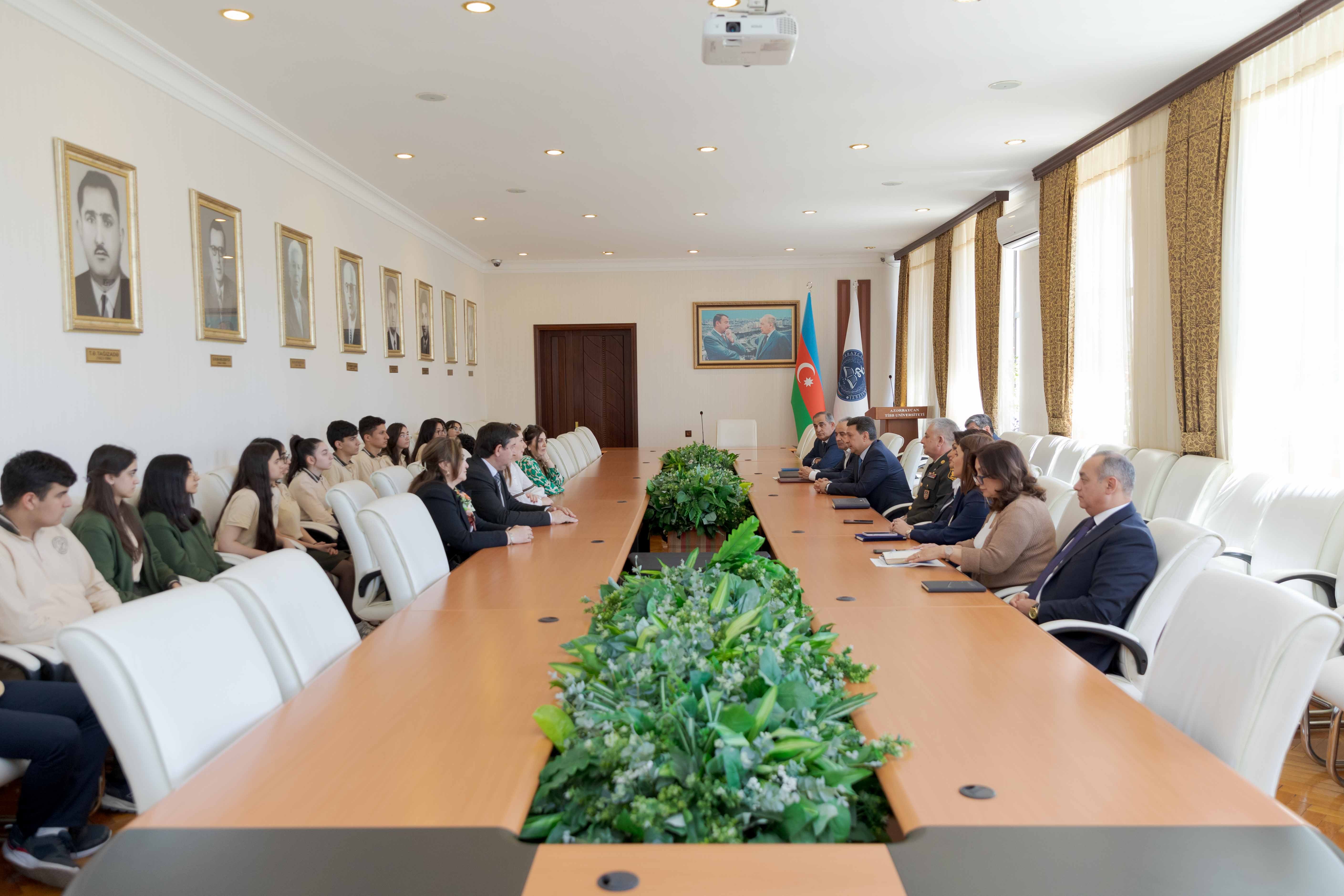 Rektor gimnaziya şagirdlərinin universitetin həyatı ilə əyani tanış olmaq təşəbbüsünü yüksək qiymətləndirib: “Ölkəmizin, cəmiyyətimizin gələcəyi olan siz şagirdlərlə görüşmək mənim üçün çox xoşdur. 90 ildən çox tarixi olan Tibb Universiteti ölkəmizin ən qabaqcıl universitetlərindən biridir. Müasir və yeniliklər tələb edən bir cəmiyyətdə universitetimiz zamandan geri qalmamağa çalışır. Dövlət rəhbərliyinin, ictimaiyyətin universitetimizə marağı olduqca yüksəkdir. Ən qabaqcıl və intellektual gənclər məhz bizim universiteti seçir. Heç də təsadüfi deyil ki, hər il 600-dən çox bal toplayan xeyli sayda abituriyent bizim universitetdə oxuyur. Tələbələrimiz öz yüksək bilikləri və bacarıqlarını təkcə tədrisdə deyil, digər sahələrdə də nümayiş etdirirlər. Onların idman, incəsənət və digər sahələrdə öz qabiliyyətlərini göstərmələri üçün universitetimizdə geniş imkanlar var, bunun üçün 12 klub fəaliyyət göstərir. “Teatr”, “Bilik”, “İdman”, “Kitab” və digər ixtisaslaşmış klublarda, o cümlədən universitetimizin ictimai həyatında tələbələrimiz fəallıq göstərirlər. Onlar 20 Yanvar, Xocalı faciəsi, Zəfər Günü, milli bayramlarımızla bağlı müxtəlif tədbirlər təşkil edirlər.