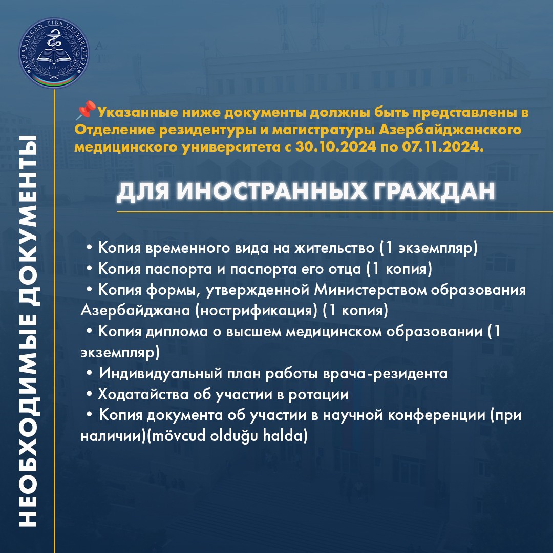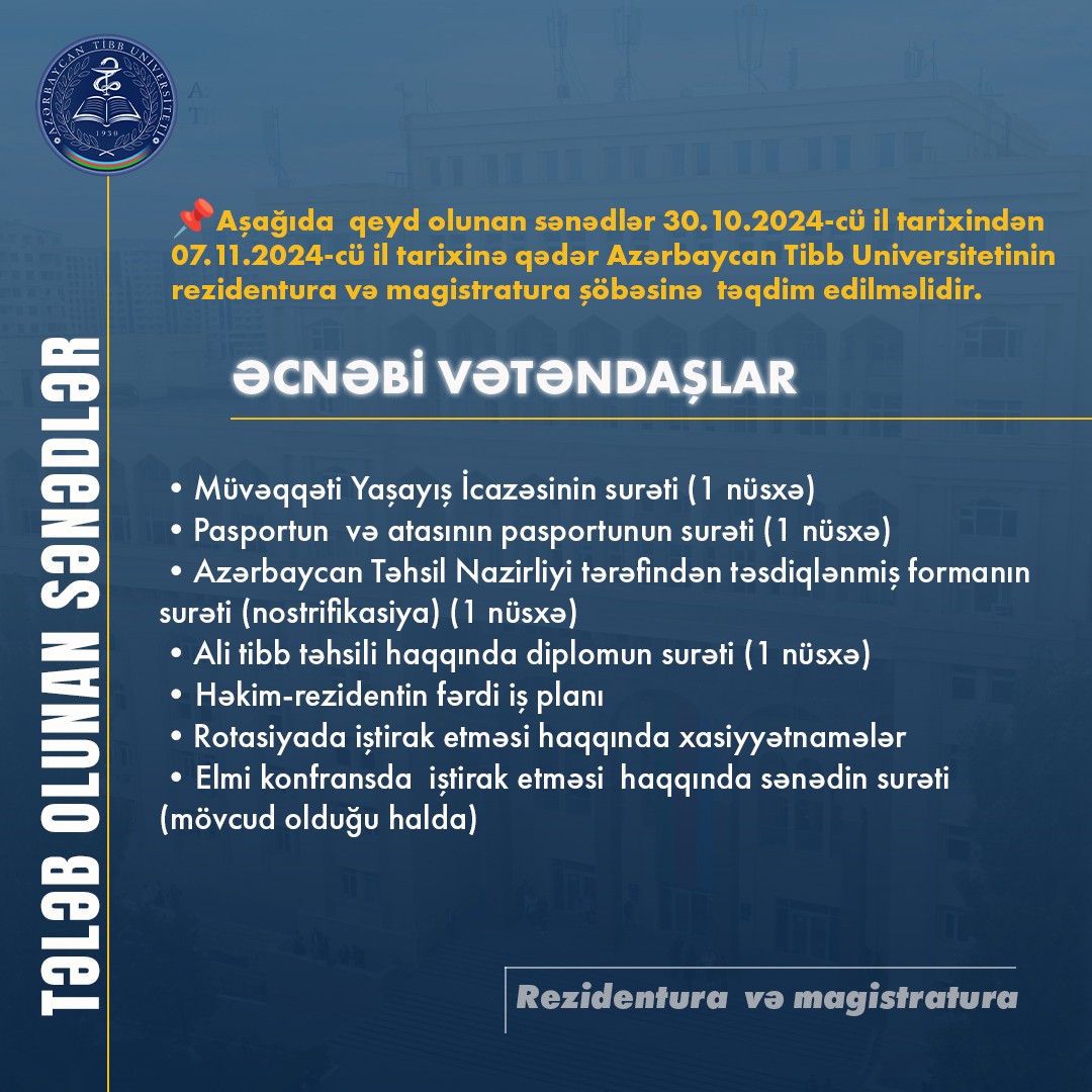 Aşağıda qeyd olunan sənədlər 30.10.2024-cü il tarixindən 07.11.2024-cü il tarixinə qədər Azərbaycan Tibb Universitetinin rezidentura və magistratura şöbəsinə təqdim edilməlidir.