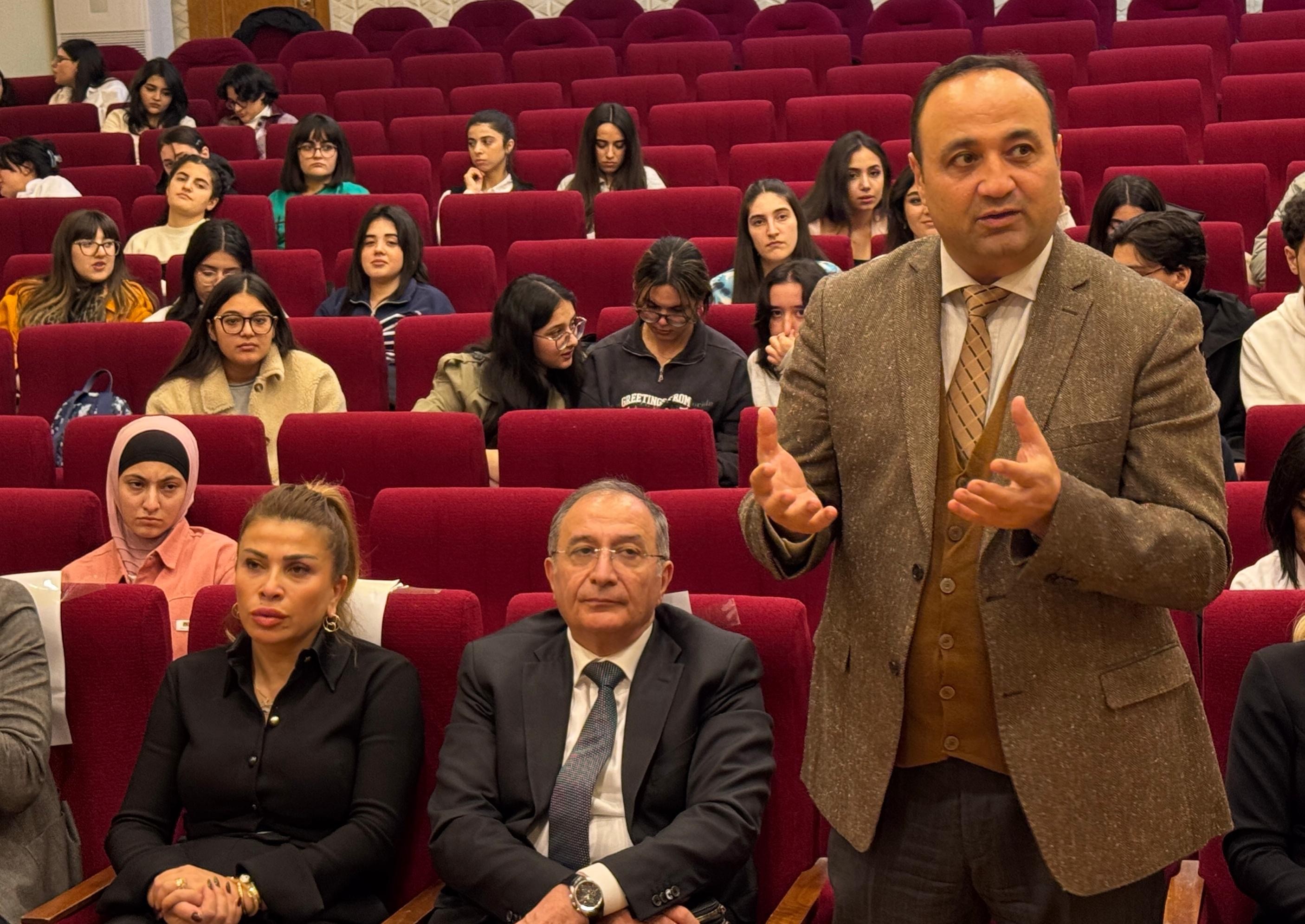 Tərbiyə işləri üzrə prorektor, dosent Mahir Səfərov noyabrın xalqımız üçün bayramlar ayı olduğunu, 44 günlük Vətən müharibəsində Ali Baş Komandan İlham Əliyevin rəhbərliyi ilə Azərbaycan Ordusunun qazandığı möhtəşəm qələbənin ildönümünü – Zəfər Gününü xalqımızın yenə təntənəli şəkildə qeyd edəcəyini nəzərə çatdırıb: “Bunun ardınca Dövlət Bayrağı Gününü bayram edəcəyik. Daha sonra isə ölkəmiz üçün tarixi əhəmiyyətli COP29 keçiriləcək”.