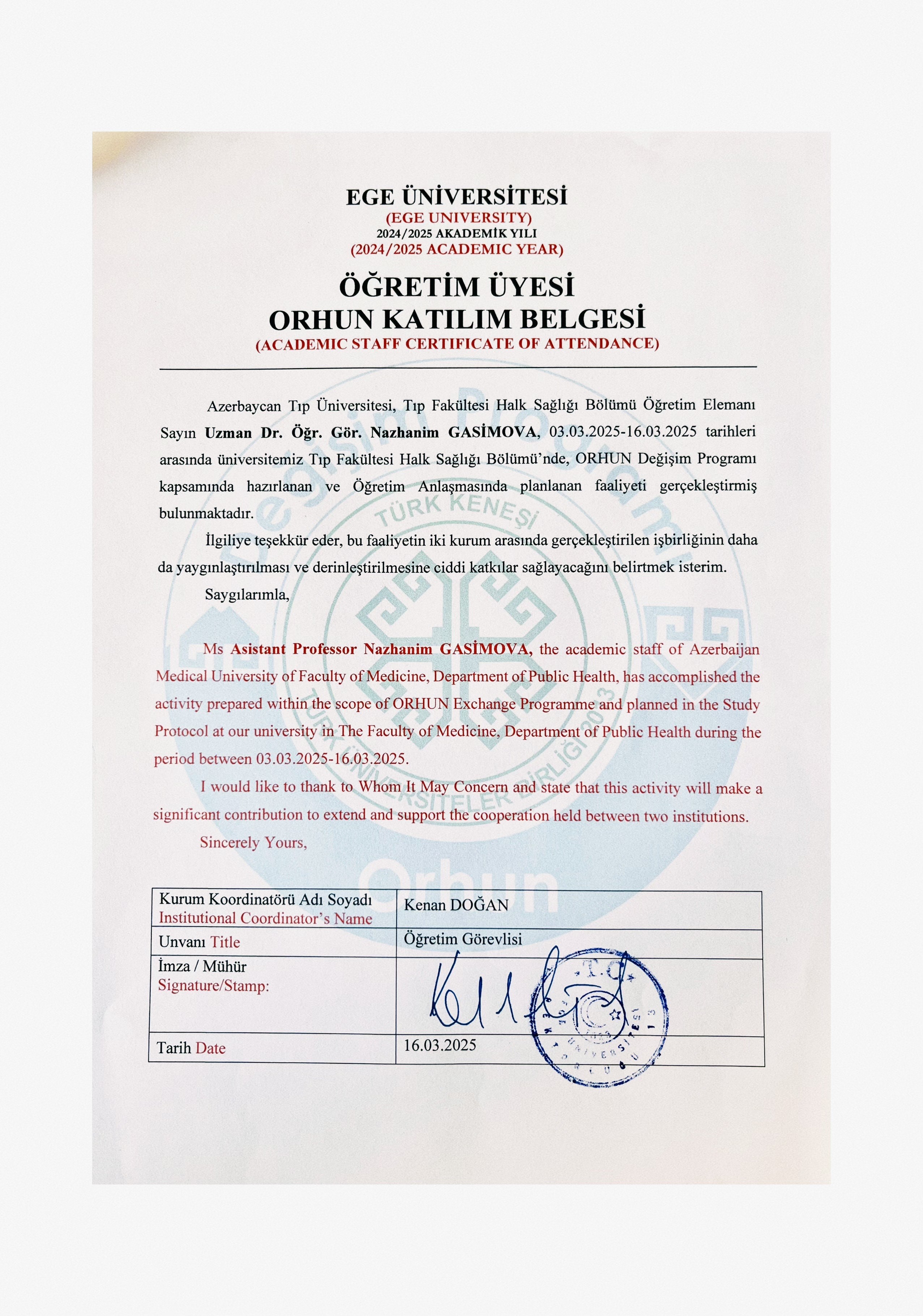 N.Qasımova iki akademik həftə boyunca Ege Universitetində dərs deməklə yanaşı, müxtəlif elmi araşdırmalarda iştirak edib, iş sağlığı və təhlükəsizliyi sahəsində aparılan tədbirlərə də qatılıb.