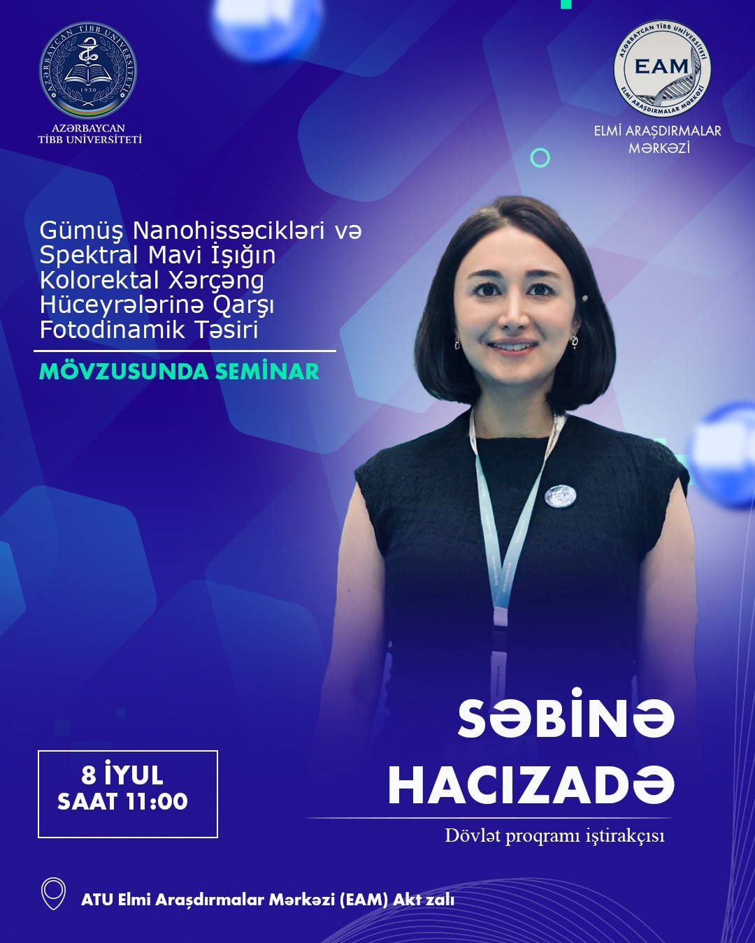 Təşkil olunan seminarda dövlət programı iştirakçısı Səbinə Hacızadə tərəfindən “Gümüş Nanohissəcikləri və Spektral Mavi İşığın Kolorektal Xərçəng Hüceyrələrinə Qarşı Fotodinamik Təsiri” mövzusu haqqında çıxış təqdim olunacaq. Qeyd edək ki, Səbinə Hacızadə Heidelberg Universitetində, Mannhaym Tibb Fakültəsi Molekulyar tibb ixtisası üzrə təhsil alır.