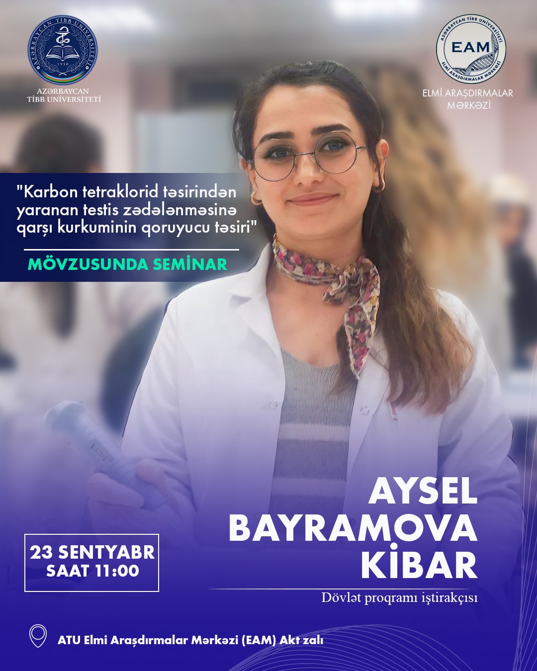 Təşkil olunan seminarda dövlət programı iştirakçısı Aysel Bayramova Kibar tərəfindən “Karbon tetraklorid təsirindən yaranan testis zədələnməsinə qarşı kurkuminin qoruyucu təsiri” mövzusu haqqında çıxış təqdim olunacaq.