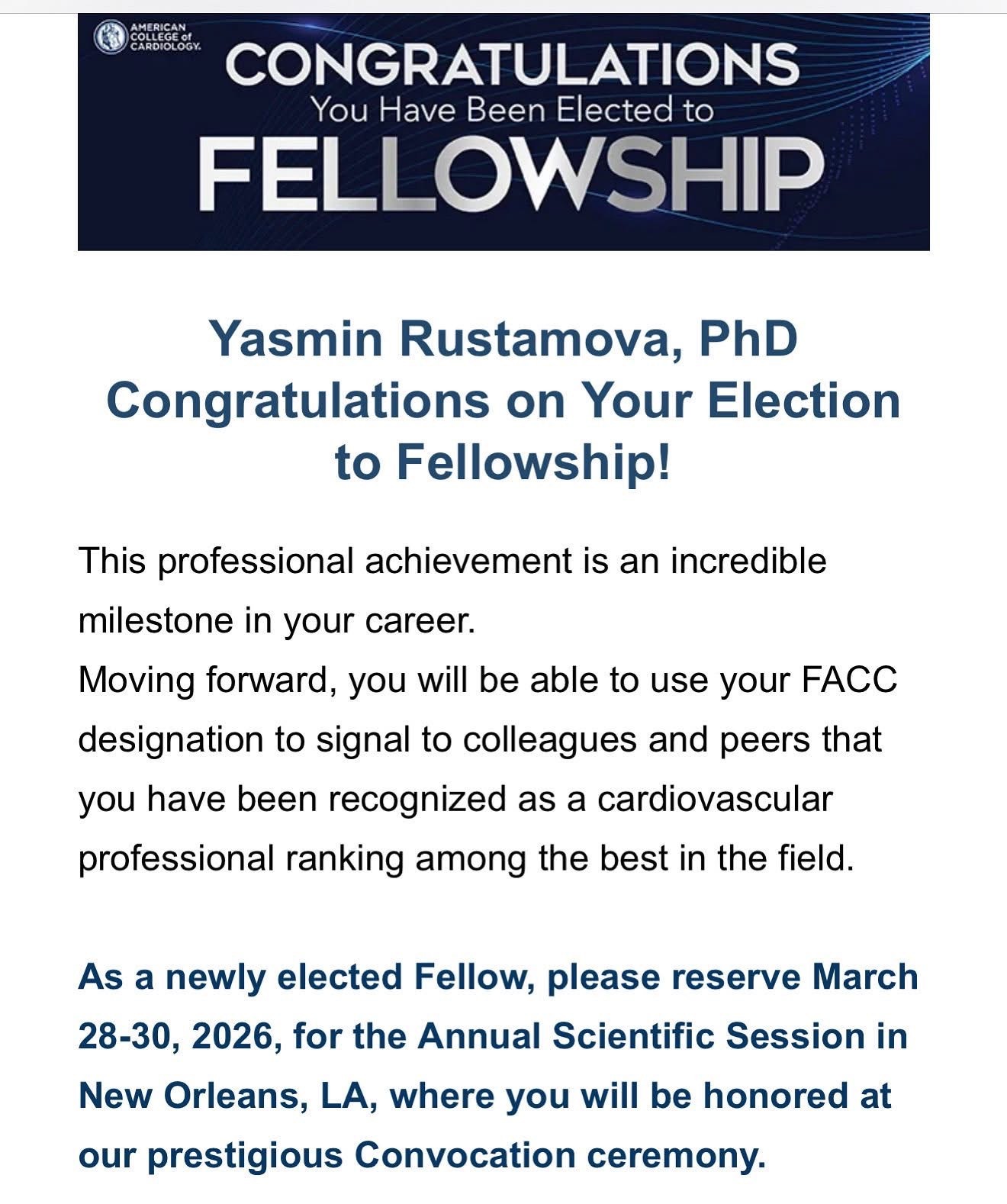 Azərbaycan Tibb Universitetinin (ATU) Tədris Cərrahiyyə Klinikasının kardioloqu, t.e.d., Yasmin Rüstəmova nüfuzlu American College of Cardiology (ACC) təşkilatının üzvü, Fellow (FACC) statusuna layiq görülüb.