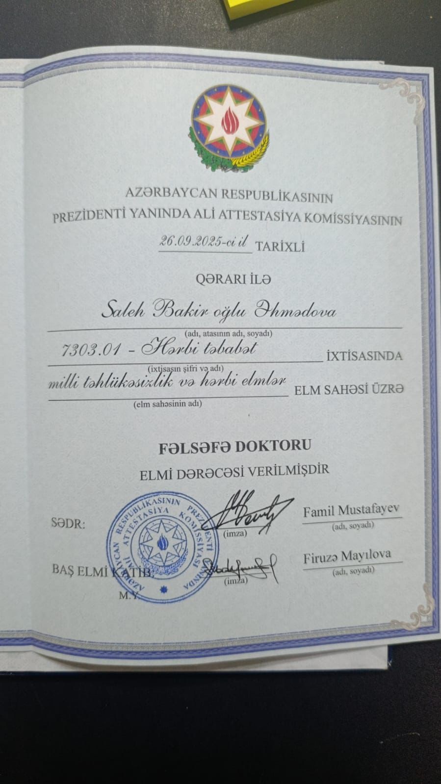 10 oktyabr 2025-ci il tarixində “Hərbi təbabət” üzrə fəlsəfə doktoru diplomu Ali Attestasiya Komissiyasının sədri Famil Mustafayev tərəfindən tibb xidməti polkovnik-leytenantı Saleh Əhmədova təqdim olunub.