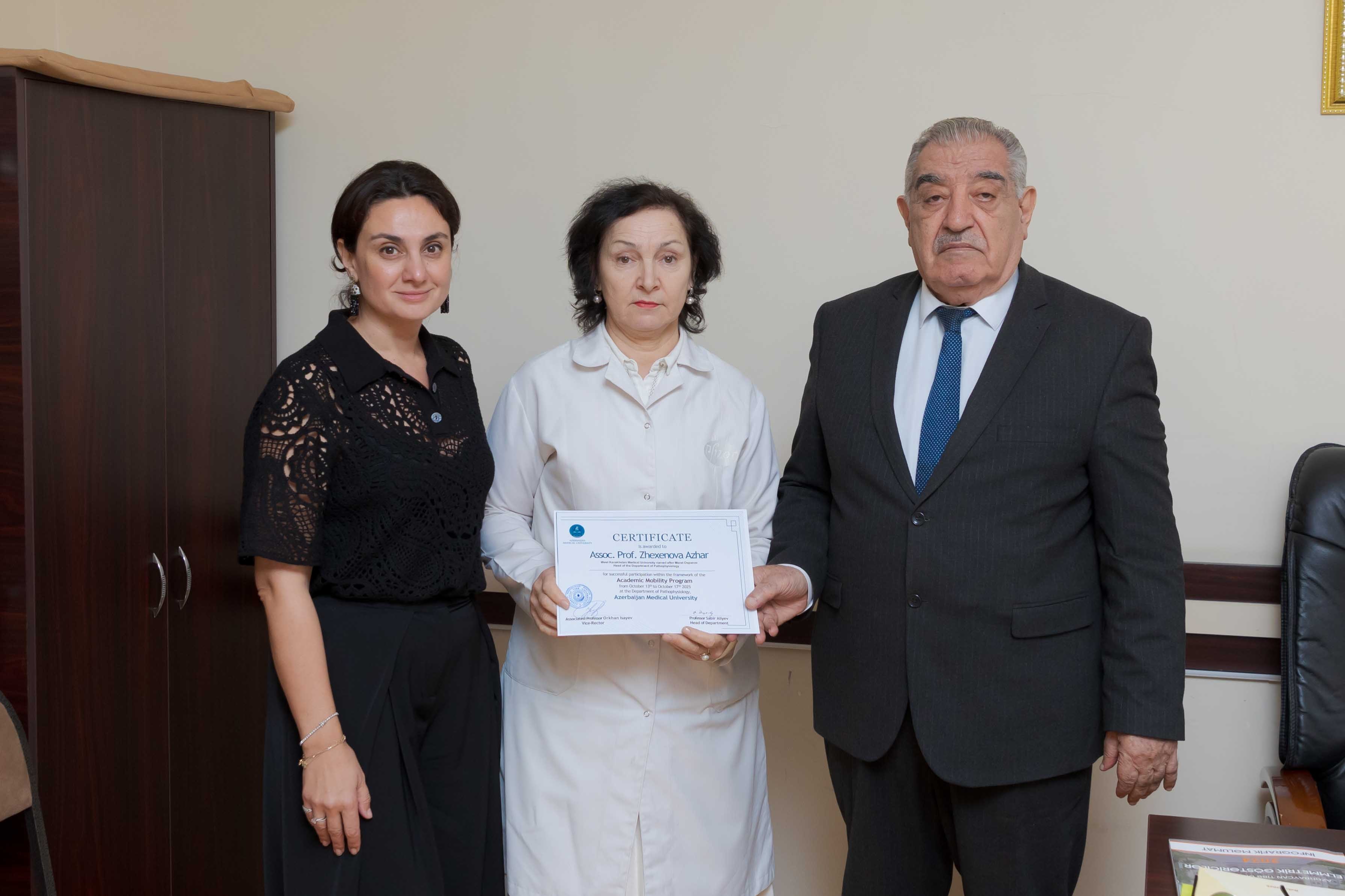 Akademik mobillik proqramı çərçivəsində Azərbaycan Tibb Universiteti (ATU) Qərbi Qazaxıstan Tibb Universitetinin (Marat Ospanov adına) Patoloji Fiziologiya kafedrasının müdiri, tibb elmləri namizədi, dosent Ajar Jeksenovanı qəbul edib
