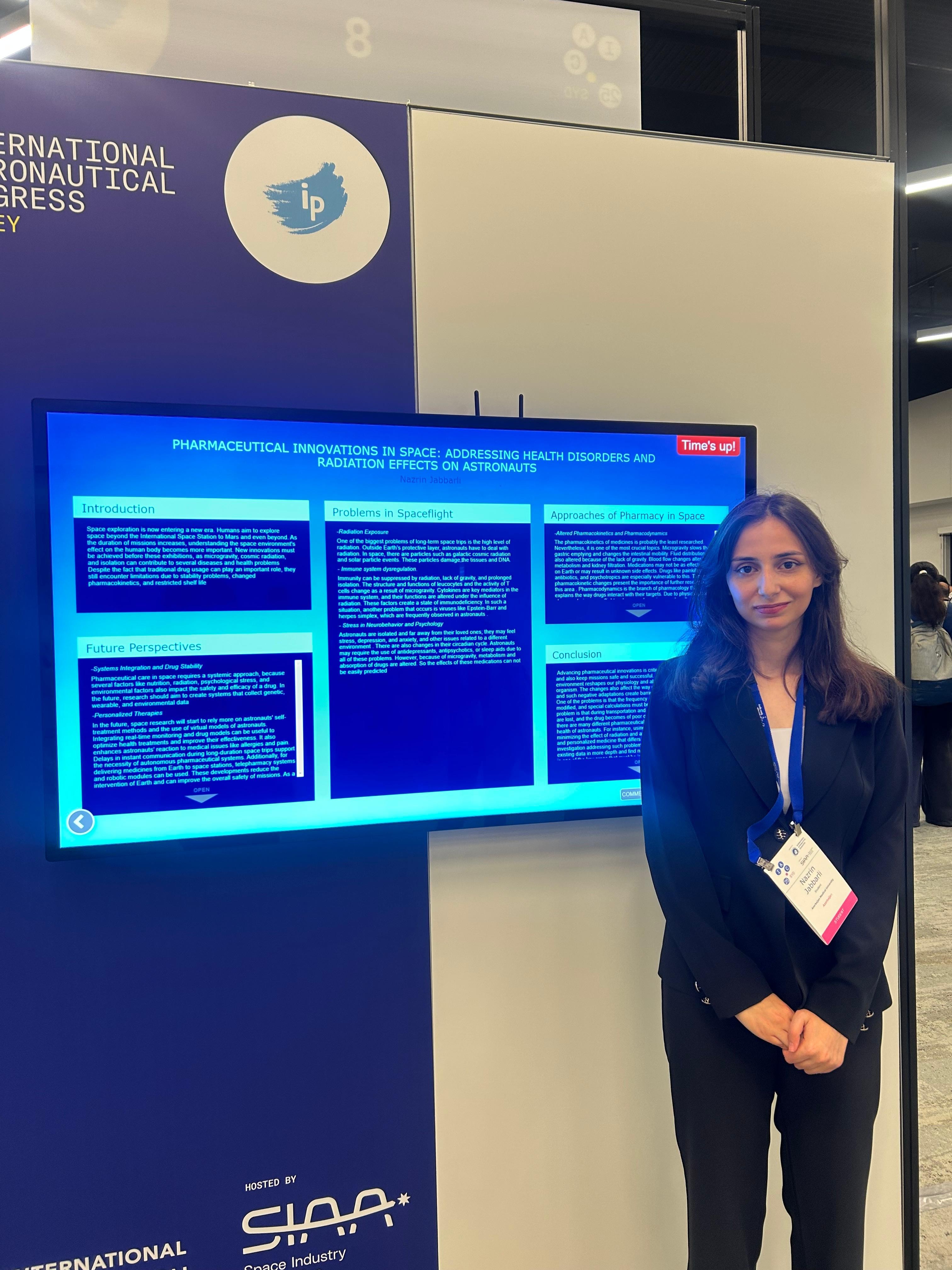 Həmçinin Əczaçılıq fakültəsinin məzunu Nəzrin Cabbarlı “Nutritional Challenges and Innovations for Long-Duration Space Missions” və “Pharmaceutical Innovations in Space: Addressing Health Disorders and Radiation Effects on Astronauts” mövzularında çıxış edərək universitetimizin elmi potensialını nümayiş etdirib.