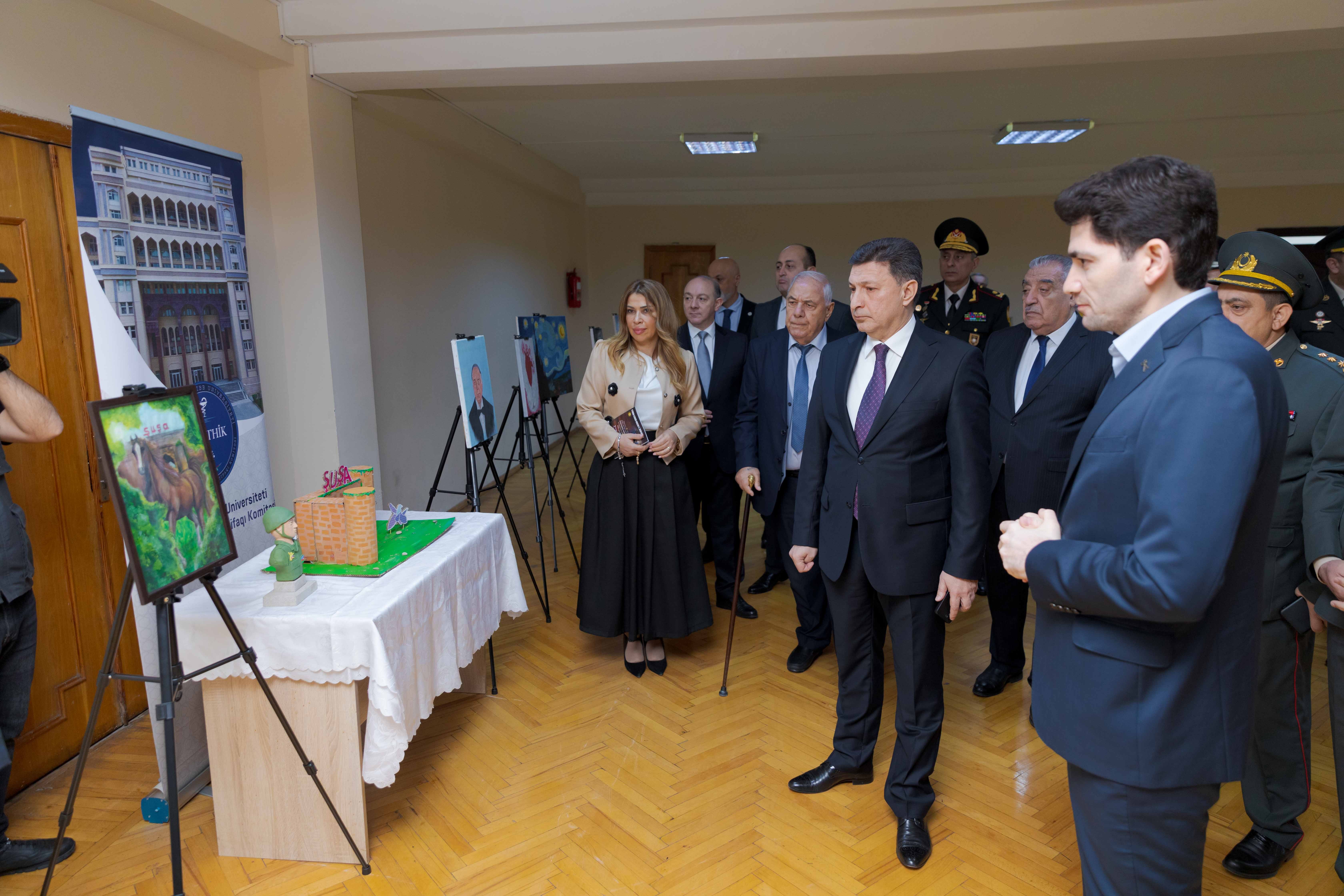 Sonra iştirakçılar Tələbə Həmkarlar İttifaqı Komitəsi və Tələbə Elmi Cəmiyyəti təşkilatçılığı ilə təqdim olunan rəsm sərgisinə baş çəkiblər. Sərgidə universitet tələbələrinin Zəfər mövzusunda 31 rəsm əsəri və 5 əl işi nümayiş olunub. Rektor tələbələrlə söhbət edib, bir-birindən maraqlı əsərlər ziyarətçilər tərəfindən yüksək qiymətləndirilib.