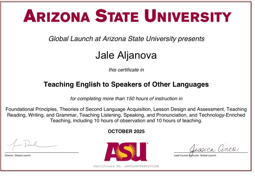 O, Arizona Dövlət Universiteti tərəfindən təşkil olunmuş nüfuzlu TESOL ixtisaslaşma kursunu uğurla başa vurub, ona müvafiq sertifikat verilib.