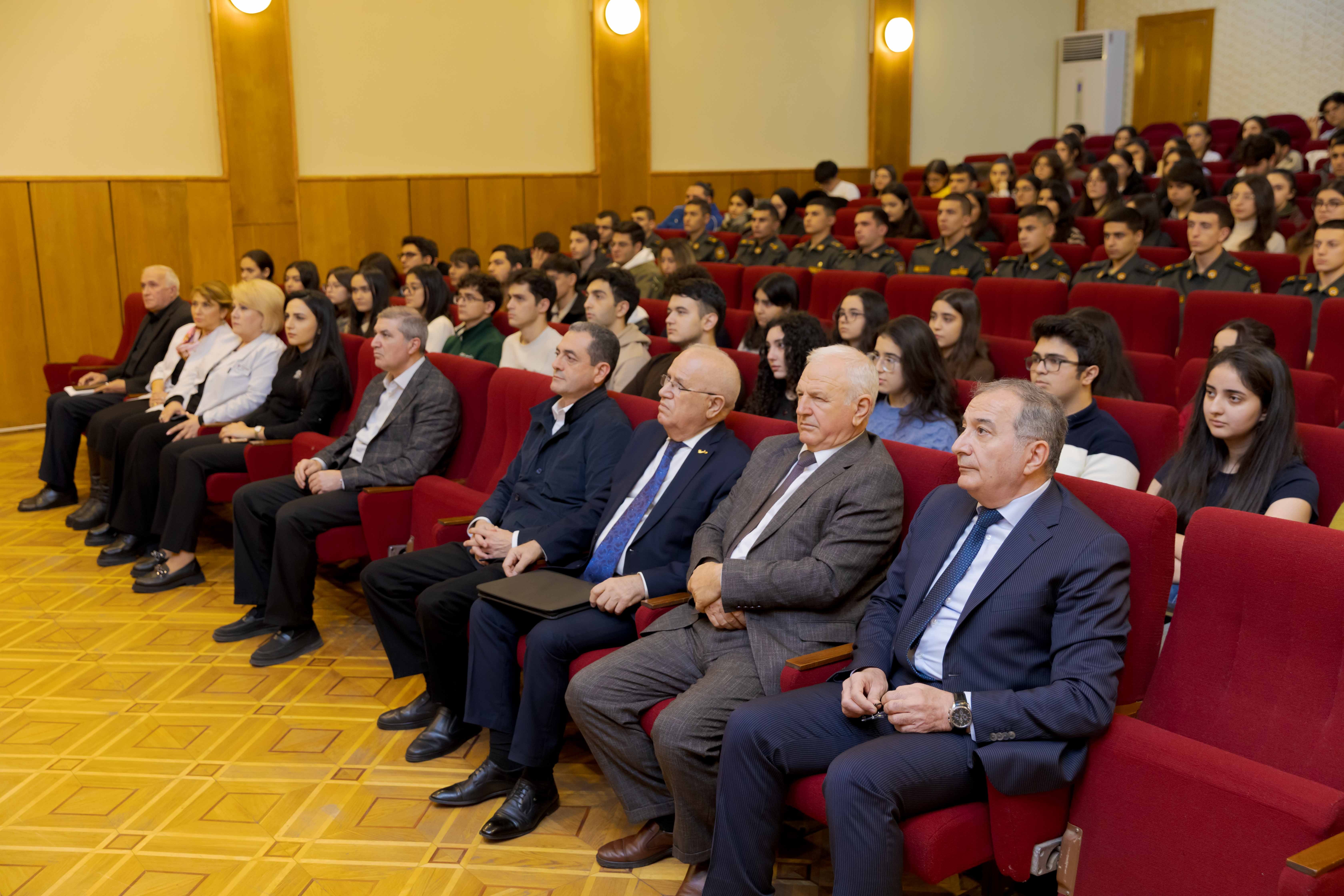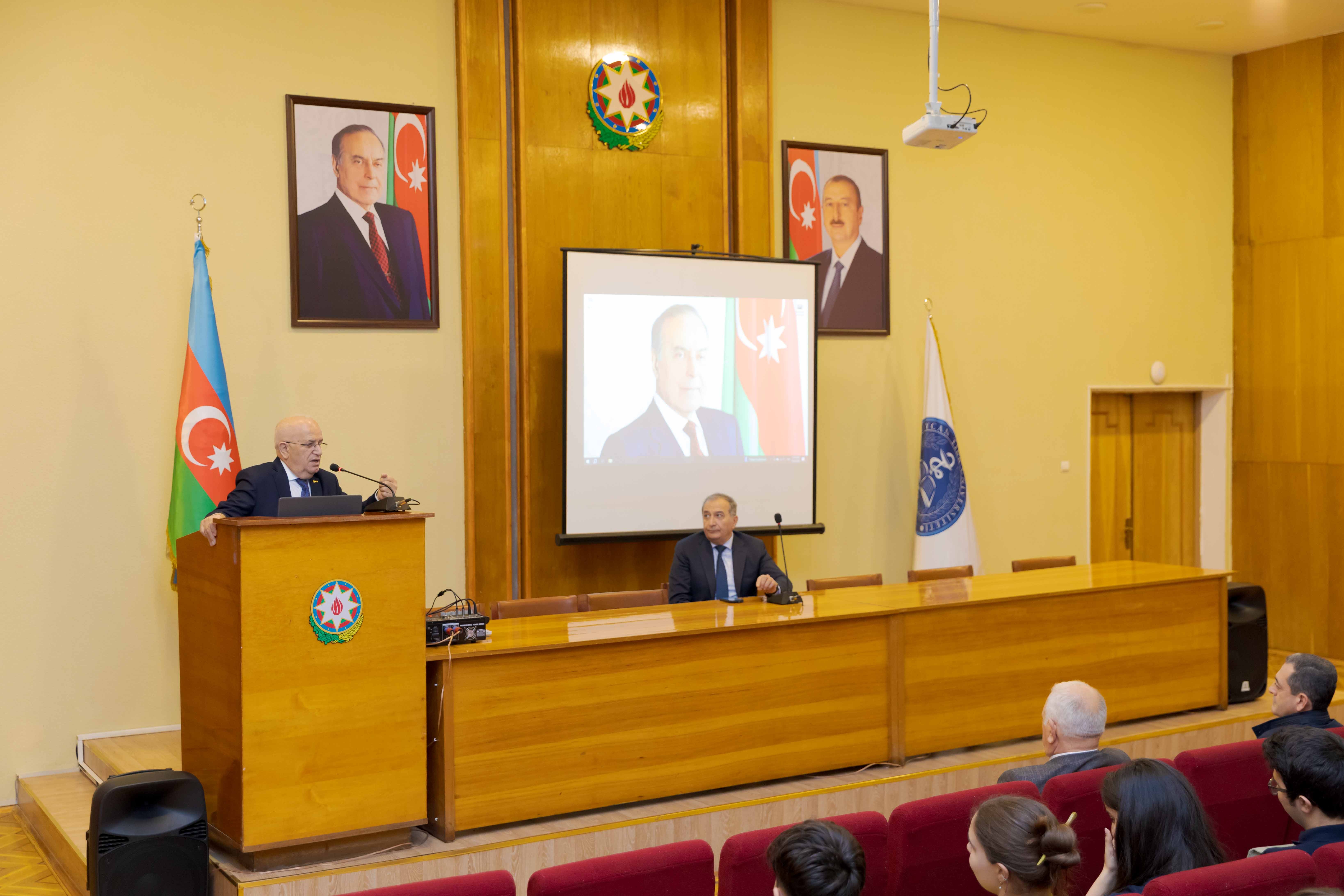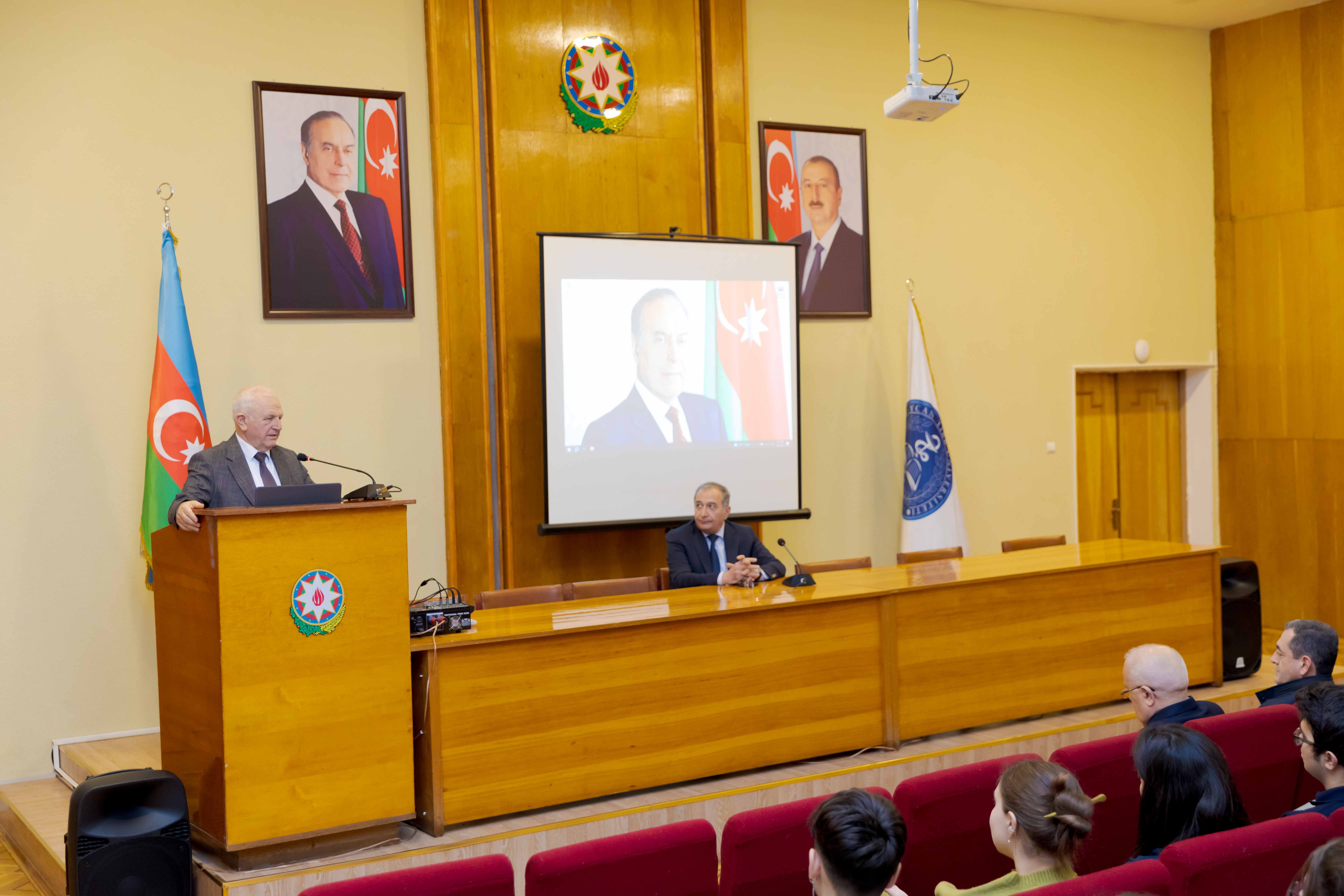 Tədbiri açan Tərbiyə işləri üzrə prorektor, dosent Mahir Səfərov Ümummilli Liderin Azərbaycan dövlətçiliyinin qorunması və möhkəmləndirilməsindəki xilaskarlıq missiyasından danışıb. O bildirib ki, bugünkü Azərbaycan gəncləri Ulu Öndər haqqında məlumatları əsasən dərsliklərdən və kitablardan öyrənirlər, halbuki orta və yaşlı nəsil onunla eyni dövrdə yaşamaq şərəfinə nail olub: