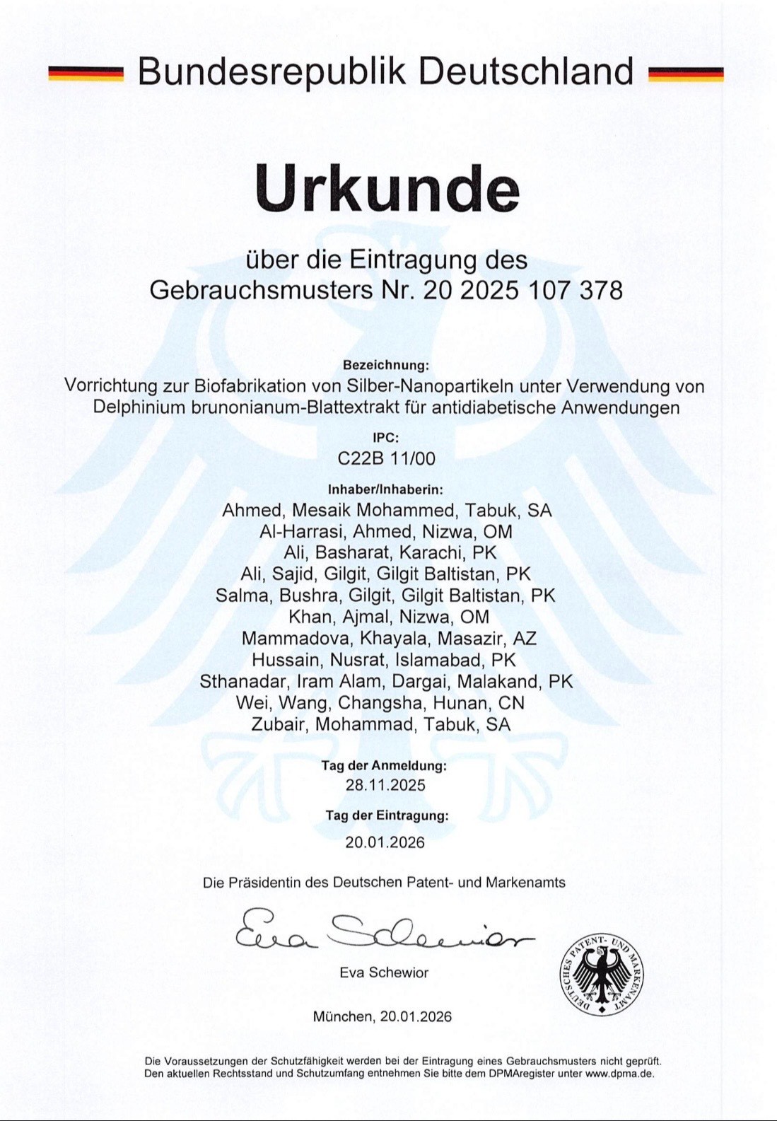 Almaniya Federativ Respublikasının Patent və Ticarət Nişanları İdarəsi (DPMA) Azərbaycan Tibb Universitetinin (ATU) dosentinin yeni elmi-texnoloji ixtirasını rəsmi şəkildə qeydiyyata alıb. Nanobiotexnologiya sahəsində mühüm bir yenilik olan bu ixtira, Delphinium brunonianum bitkisinin yarpaq ekstraktından istifadə edərək gümüş nanohissəciklərin (AgNPs) “yaşıl” üsulla sintezini təmin edən xüsusi bir texniki qurğu ilə tanınır. Bu metod, ekoloji təhlükəsiz yanaşması ilə diqqət çəkir və texniki yeniliyin hüquqi mühafizəsini təmin edir. Bu ixtiranın hüquqi sahibləri arasında Azərbaycan, Pakistan, Oman, Səudiyyə Ərəbistanı və Çin alimləri yer alır. Azərbaycan tərəfdən layihənin həmmüəllifi, Azərbaycan Tibb Universitetinin (ATU) Tibbi və Bioloji Fizika kafedrasının dosenti Xəyalə Məmmədovadır. Layihə beynəlxalq elmi əməkdaşlıq çərçivəsində həyata keçirilib və müxtəlif elmi məktəblərin bilik və təcrübəsini bir araya gətirib.