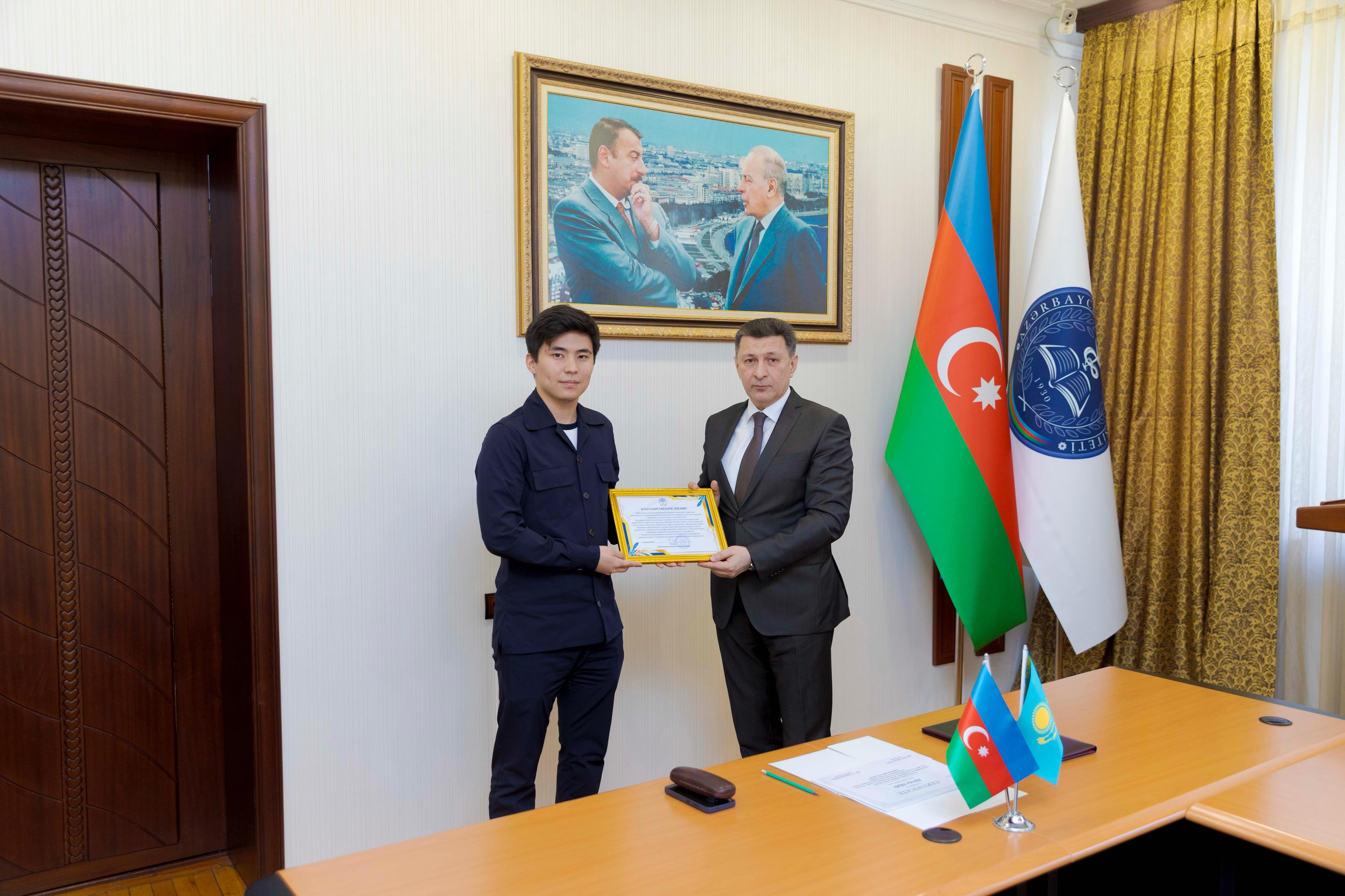 Qazaxıstan Respublikasının Cənubi Qazaxıstan Tibb Akademiyasının Tibb ixtisası üzrə təhsil alan III kurs tələbələri ilə keçirilən görüşdə rektor İki ölkə arasında bütün sferalarda irəliləyən yaxın dostluq münasibətlərindən söz açıb.